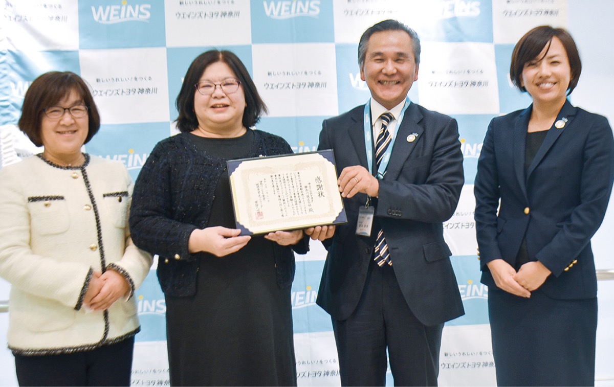 ウエインズトヨタ神奈川株式会社=中区山下町=が、地域貢献を目的に展開している取組「ウエインズまちいちファンド」の積み立て資金を、神奈川県内98カ所の子ども食堂に各5万円ずつ、計約500万円を支援した。これに対し、支援先を取りまとめた「神奈川こども食堂・地域食堂ネットワーク」から1月11日、同社に感謝状が贈呈された。