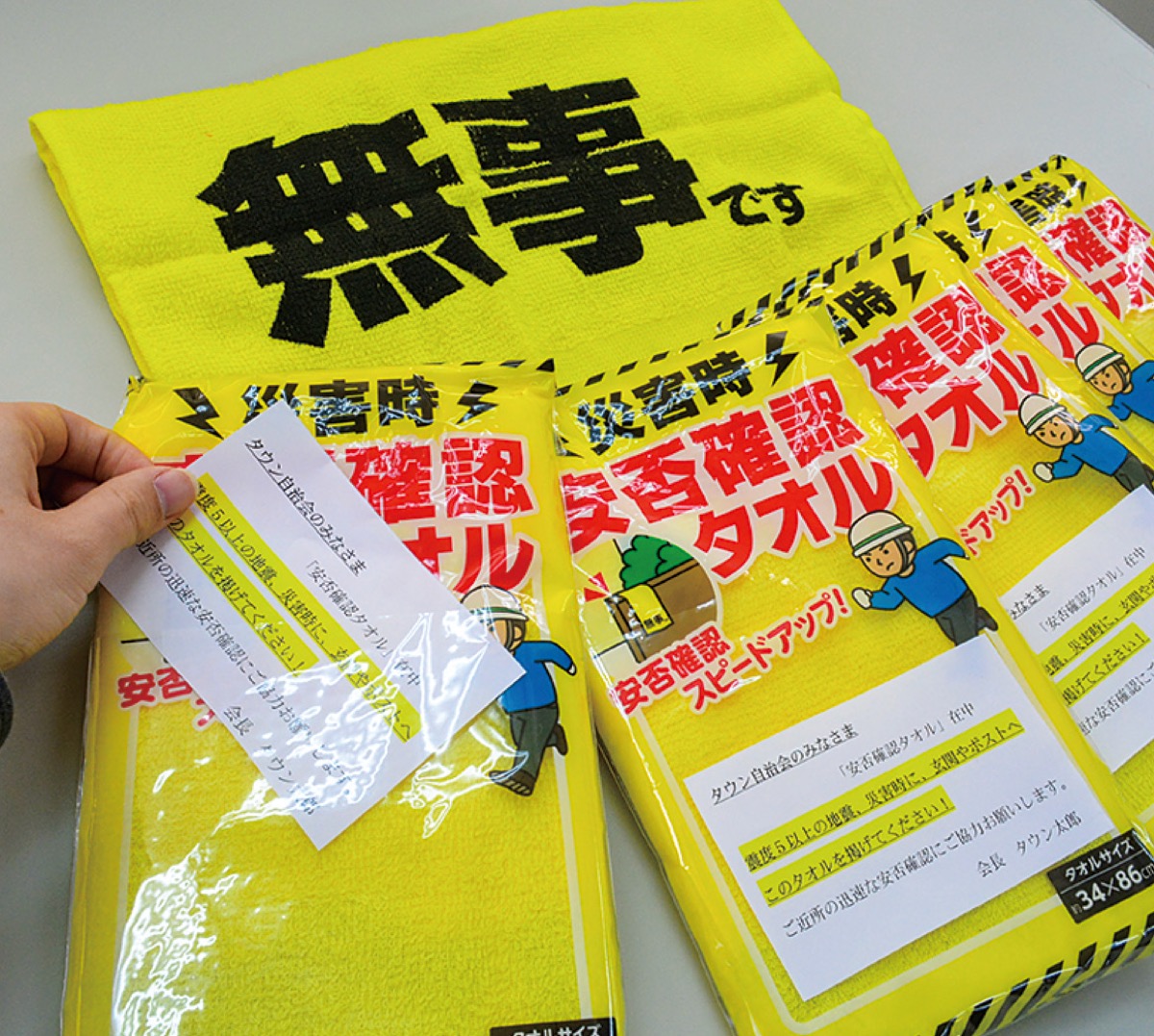 発災時「無事です」と書かれた黄色いタオルを外に掲げることで無事を周囲に知らせ、安否確認の手間と時間を省略化。貴重な人手を必要な場所へ回し、迅速効率的な救助活動につなげられる。