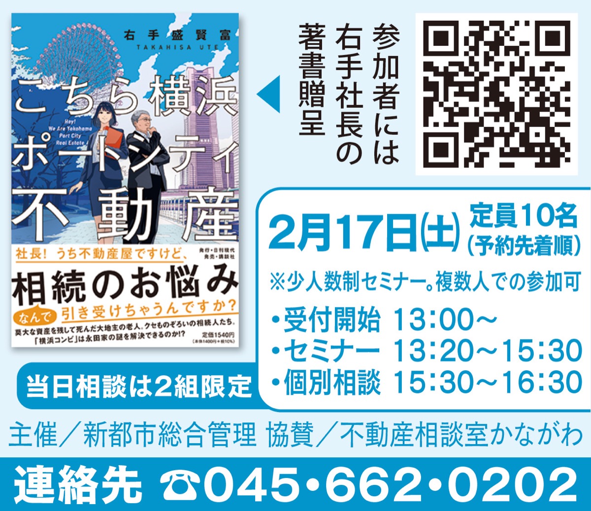 好評のセミナー「親子で考えるもめない相続対策」が2月17日(土)午後1時20分から、横浜駅西口から徒歩5分のかながわ県民センターで行われる。参加無料、定員10人。個別相談も有(2組限定、要申込)。