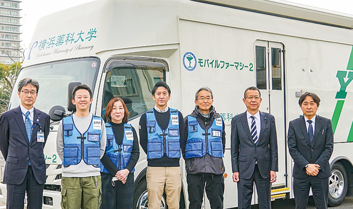 横浜市薬剤師会(坂本悟会長)は1月10日、能登半島地震の被災地支援のため災害時対策医薬品供給車(モバイルファーマシー)を派遣。横浜薬科大学=戸塚区=で出発式を行った=写真下。