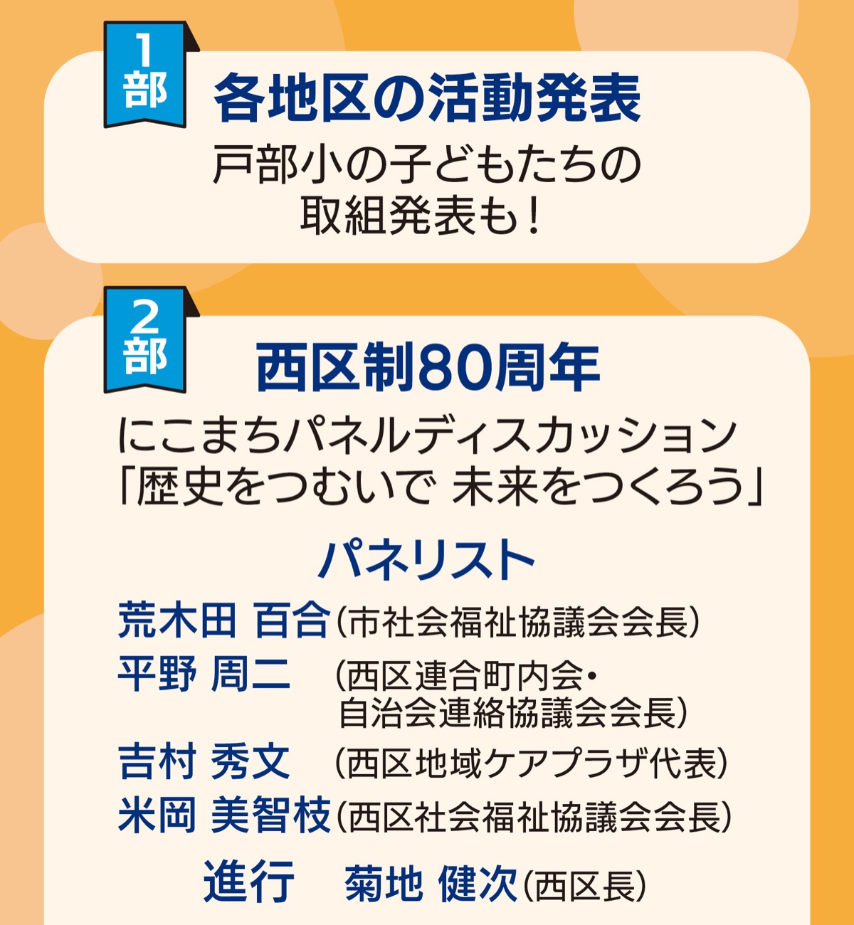 西区制80周年を記念し、今年は西区の未来について関係者が語り合うパネルディスカッションも企画=表参照。災害など、いざという時にも地域のつながりの重要性は改めて注目されており、西区福祉保健課は「地域活動に参加したことがない方にも、ぜひご来場いただきたい」と呼び掛けている。