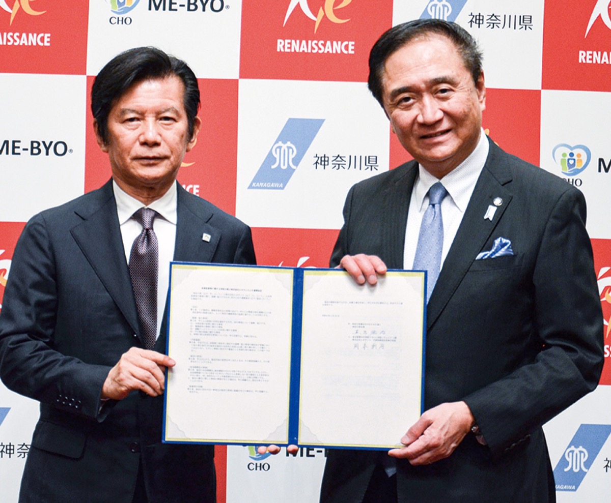 健康と病気の間の状態「未病」改善の推進に取り組む神奈川県は1月23日、全国でスポーツクラブなどを展開する(株)ルネサンスと、健康長寿社会の実現に向けて、未病改善や健康経営などに関し、連携協定を締結した。県庁で締結式が行われ、黒岩祐治知事と岡本利治社長が協定書に署名した。