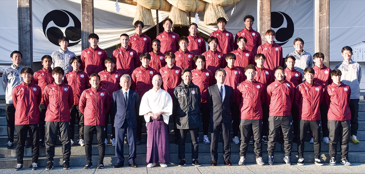 サッカーJ3のYSCCが1月25日、今シーズンの必勝祈願に地元の鎮守・本牧神社を訪れた。トップチームのメンバー31人と倉貫一毅監督やコーチ陣を含め約40人が参列、決意を新たにしていた。境内での神事の後、同神社の當麻洋一宮司と共に記念撮影を行った=写真。