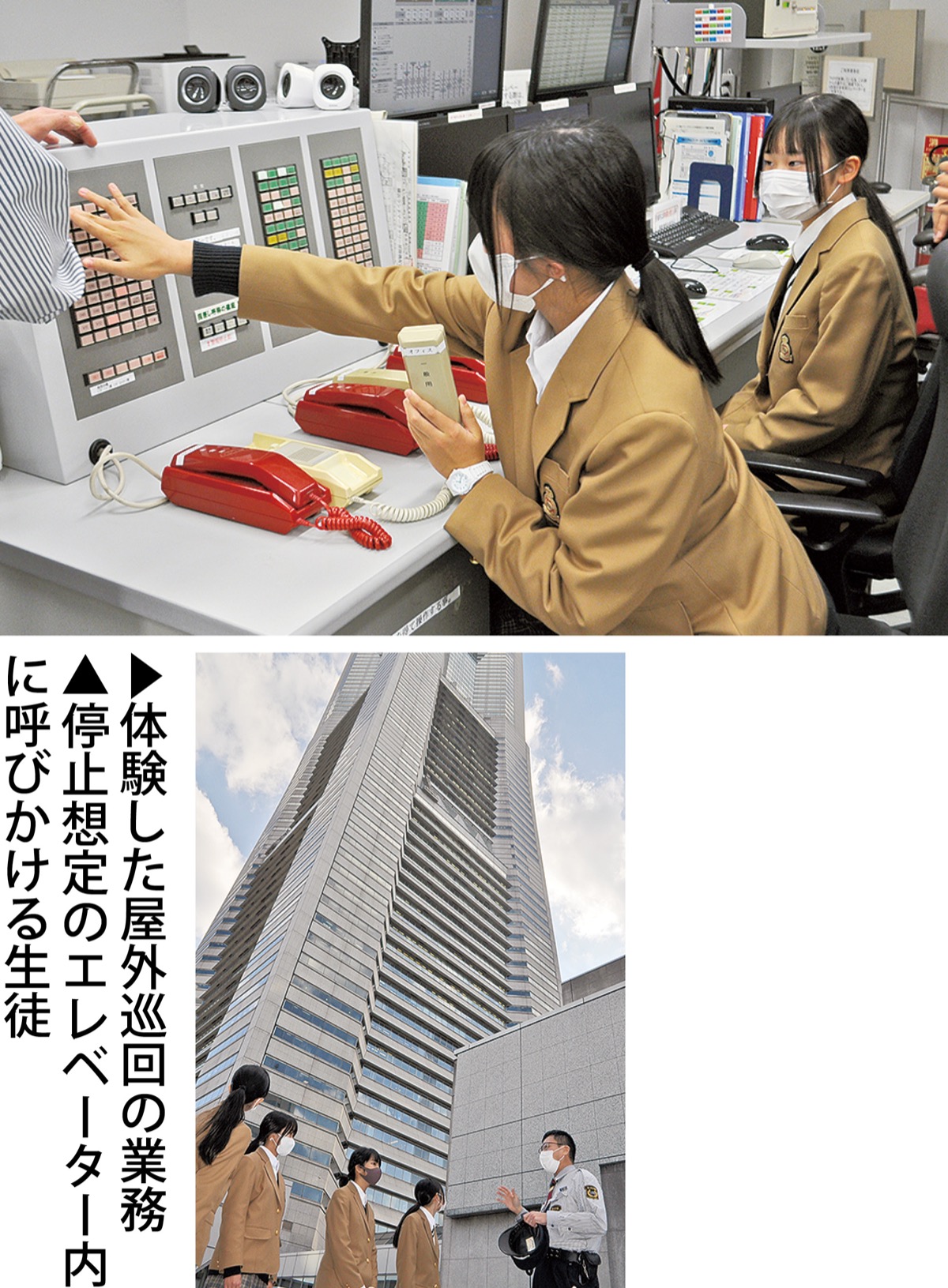施設の防災・防犯を担う防災センターの業務では、職員から入館手続きや落とし物の対応、警報が鳴った時の動きなどの説明を受けた。また、巡回業務の実践では、屋外やオフィス、商業フロアを実際に歩き、落とし物の確認や不審者が潜んでいないかなどのポイントを確認していた。