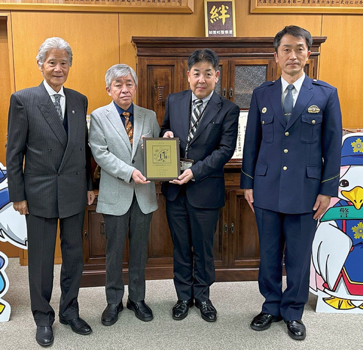 中区初の「よこはま防災力向上マンション」に選ばれたザ・タワー横浜北仲の安全管理委員会・太田伸一郎委員長が1月26日、加賀町警察署を訪問し、同署の森田仁志署長とテロ・災害対策協力会の髙木正俊会長に認定証を披露した。
