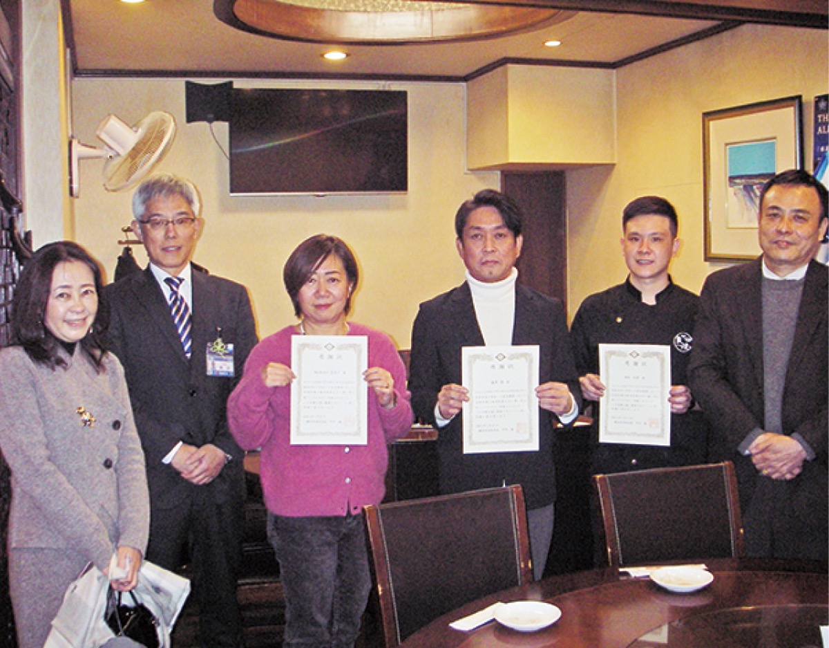 中消防署(黒岩大輔署長)は1月27日、中区末吉町の中華料理店・敦煌で心肺停止となった56歳の男性の人命救助を行ったとして、店員ら3人に感謝状を贈った。