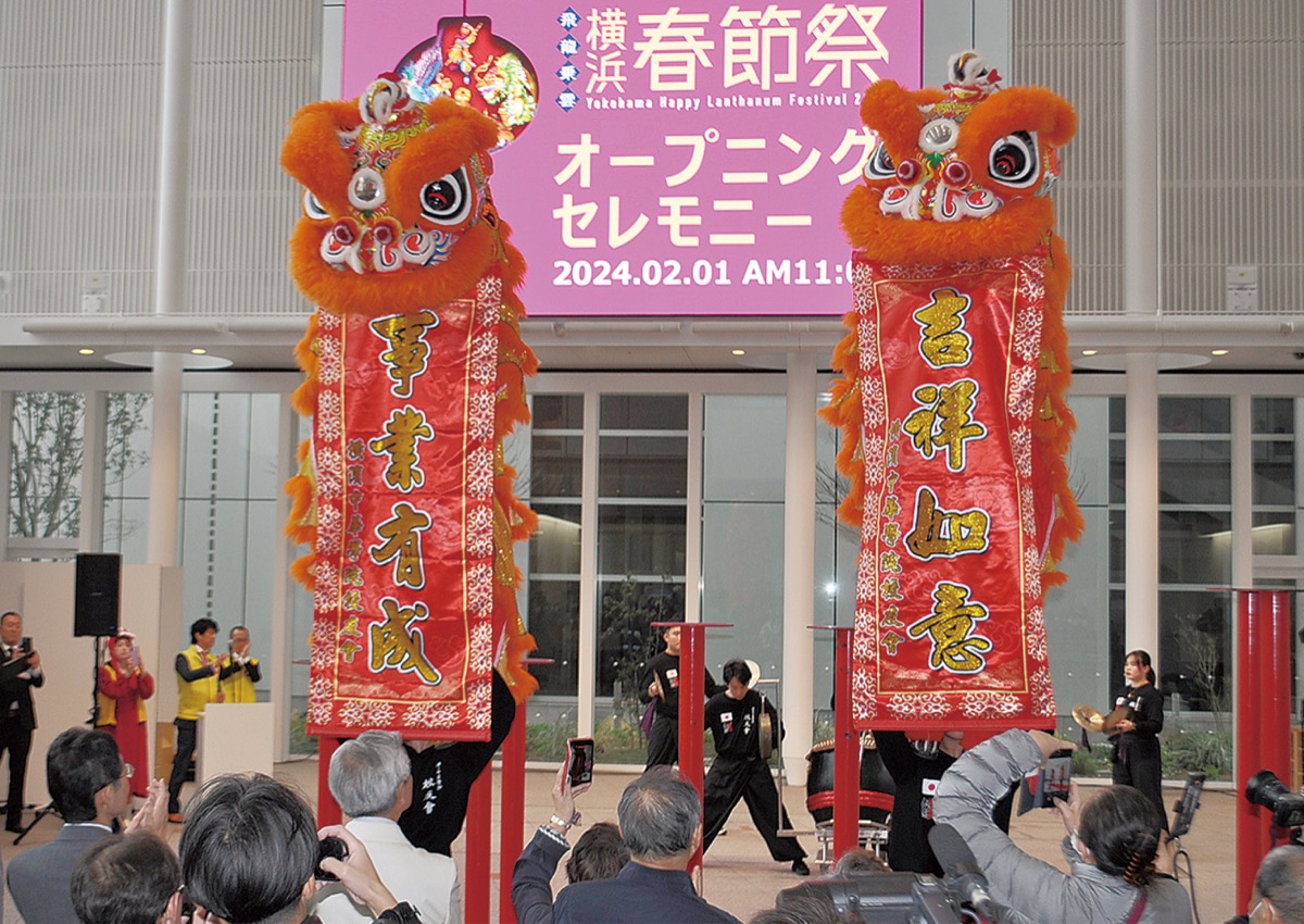 オープニングセレモニーには山中竹春市長をはじめ、約150人が集まり、横浜中華学院校友会による獅子舞が披露され、会場を盛り上げた。1年の悪疫災厄退散のほか、能登半島地震の復興を願い、中国の赤い封筒「紅包(ホンパオ)」に入れた義援金を獅子舞が口にするなどのパフォーマンスも行われた。