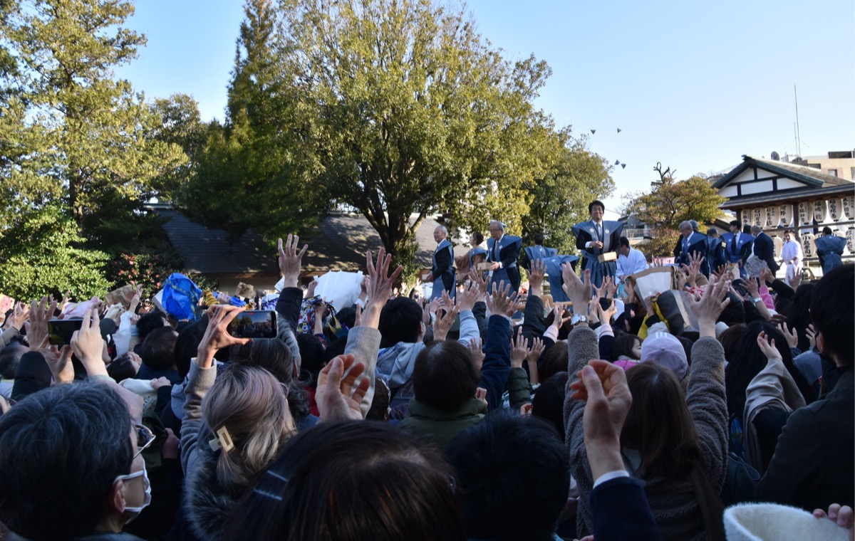 豆まきの前にあいさつした阿久津裕司宮司は、コロナ禍の間も疫病や災害をはらうため節分祭を継続してきたことを説明。今年1年の無病息災と能登半島地震の復興を願った。また節分会の藤木幸夫会長は「節分というこの節目に、人々の幸せを願う。皆さまそれぞれが心に新たな“灯り”をつけてください」と呼び掛けていた。