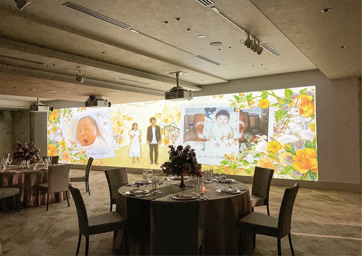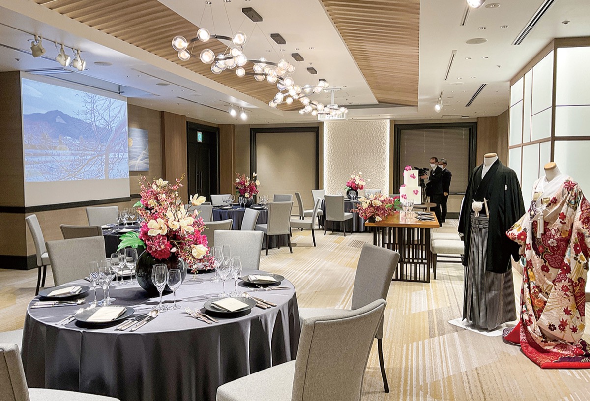 デザインコンセプトに「シンプルモダン」を掲げた宴会場は、大人数から親族のみのウエディングまで幅広く対応する。横幅12メートルのパノラマ画面のシアターワイドビジョンや、光と音の演出ができる最新設備も新たに導入した。立食の場合は、最大400人まで可能。
