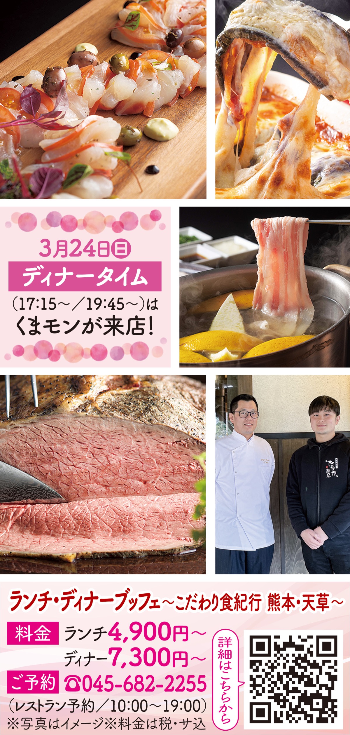 みなとみらい駅直結の横浜ベイホテル東急2階「カフェ トスカ」では、ランチ・ディナーブッフェ「こだわり食紀行 熊本・天草」を開催中(4月25日(木)まで※ディナーは24日まで)。「天草さくら鯛のマリネ」といった海産物をはじめ、あまくさ宝牧豚のしゃぶしゃぶ(ディナー限定)などシェフ・田京伸五氏が熊本・天草で出会った食材を用いた、春らしい色とりどりのメニューがずらり。目の前で調理してくれる、4種類の味で楽しめるローストビーフ、サツマイモを揚げた郷土料理「がね」なども必見。