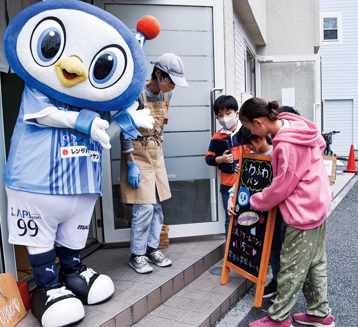 2月29日には、横浜をホームに活躍するサッカーJ1チーム、横浜FCのマスコット・フリ丸と一緒に児童らが新しいボードを持って各店舗を訪問。その内の1つ「レポブレッド」のボードを担当したコルビー美喜さんは「フリ丸が目立つように描いた」と話した。池田さくらさんは「ふわふわのパンを伝えようと、文字を太めにして工夫した」と説明した。同店のオーナー、相馬奈穂さんは「子どもたちと接すると楽しいですね」と笑顔で語っていた。