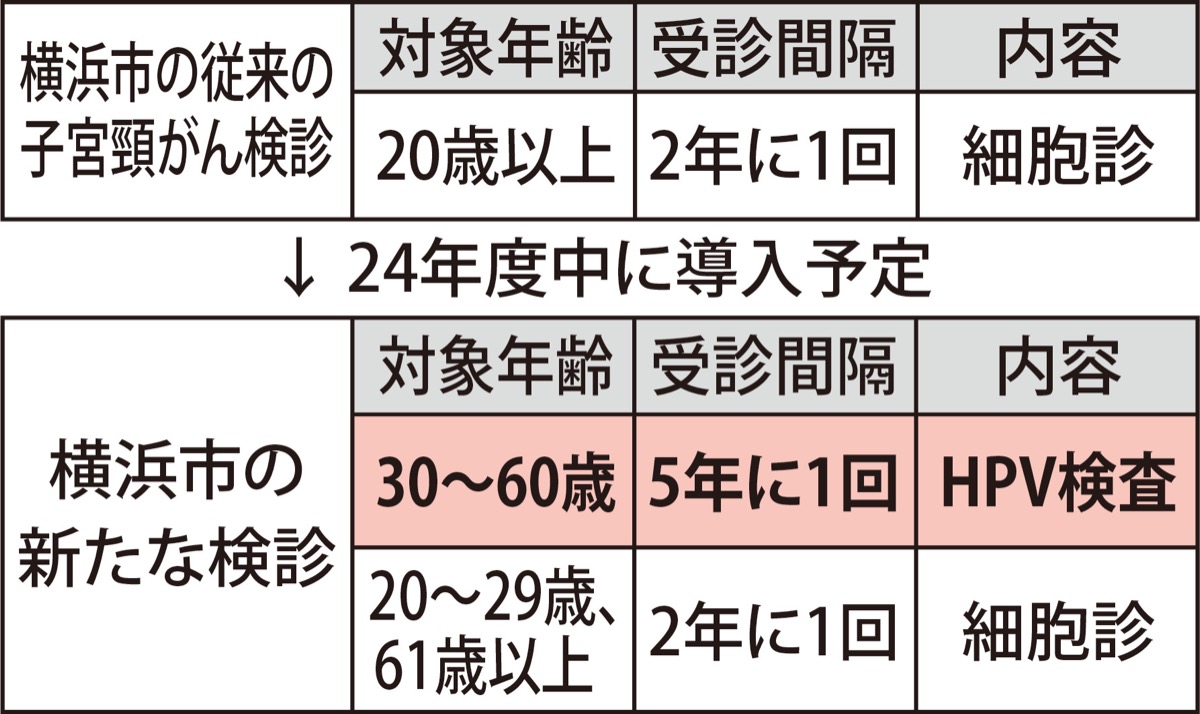 横浜市は国の指針改正を受け、24年度早期に新たながん対策に着手する。30歳以上から60歳までを対象に、子宮頸がんの原因となるヒトパピローマウイルス(HPV)の感染の有無を調べる検診を導入。20歳以上への一律の細胞診検査から、HPV検査により、高リスク者に絞った検診が行えるようになるという。