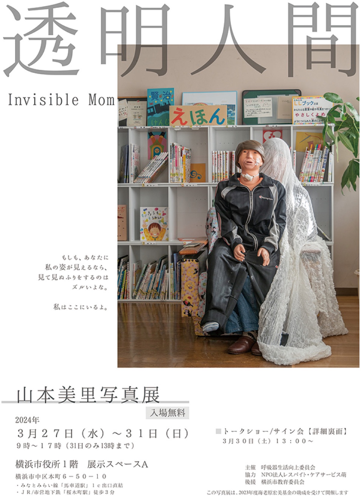 写真家・山本美里さんの写真展「透明人間 Invisible Mom」が3月27日(水)から31日(日)まで、横浜市役所1階展示スペースAで開催される。午前9時から午後5時(31日は1時)まで。入場無料。呼吸器生活向上委員会主催。
