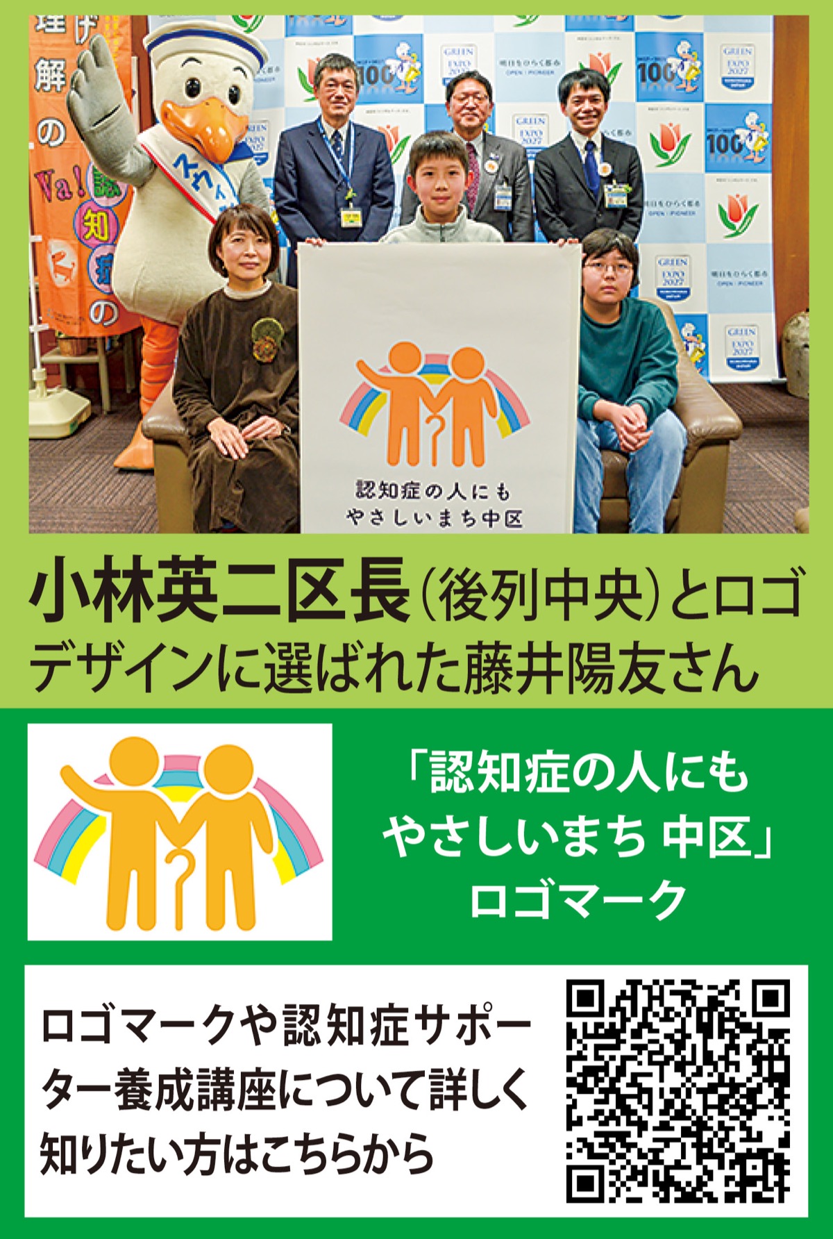 区内在住在学の小中高生を対象にデザインを募集した「認知症の人にもやさしいまち 中区」のロゴマークが3月8日に決定しました。子どもたちが認知症に関心を持ち、困ってる人を助けたいと応募してくれたことを頼もしく思います。