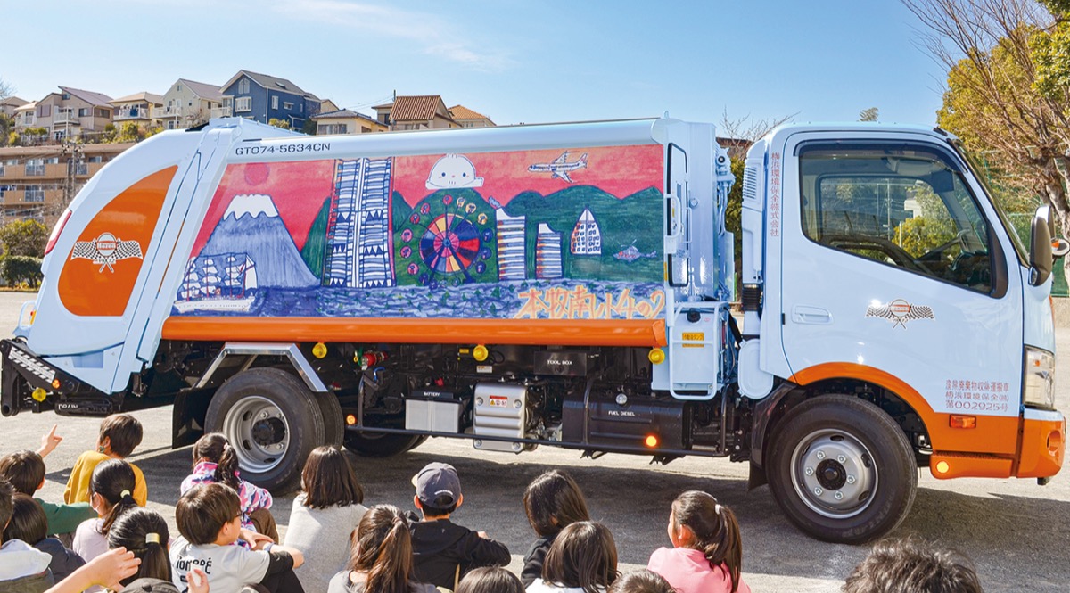 同社では、廃棄物の収集を身近に感じてもらうため、親しみやすいデザイン車の導入を進めている。今回、全員に当事者意識をもってほしいという教員からの提案で、1人のイラストではなく、クラス全員で描き上げたものを採用したという。