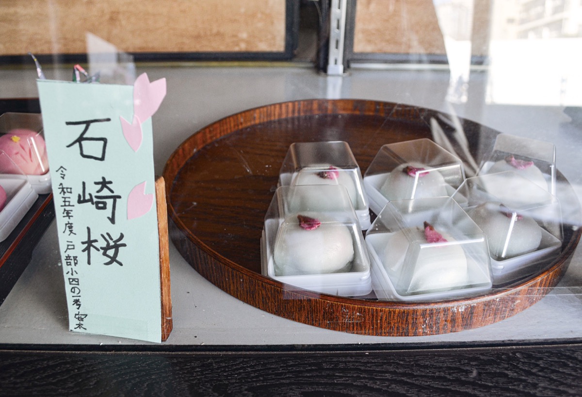 石崎川に浮かぶ桜をイメージした商品は、桜餡を求肥(ぎゅうひ)で包み桜の塩漬けを乗せた春らしいものとなっている。子どもたちは「甘じょっぱく、味のバランスが良い商品になった」「季節感を大事にする和菓子。春の訪れを感じるようなものにした」と話している。