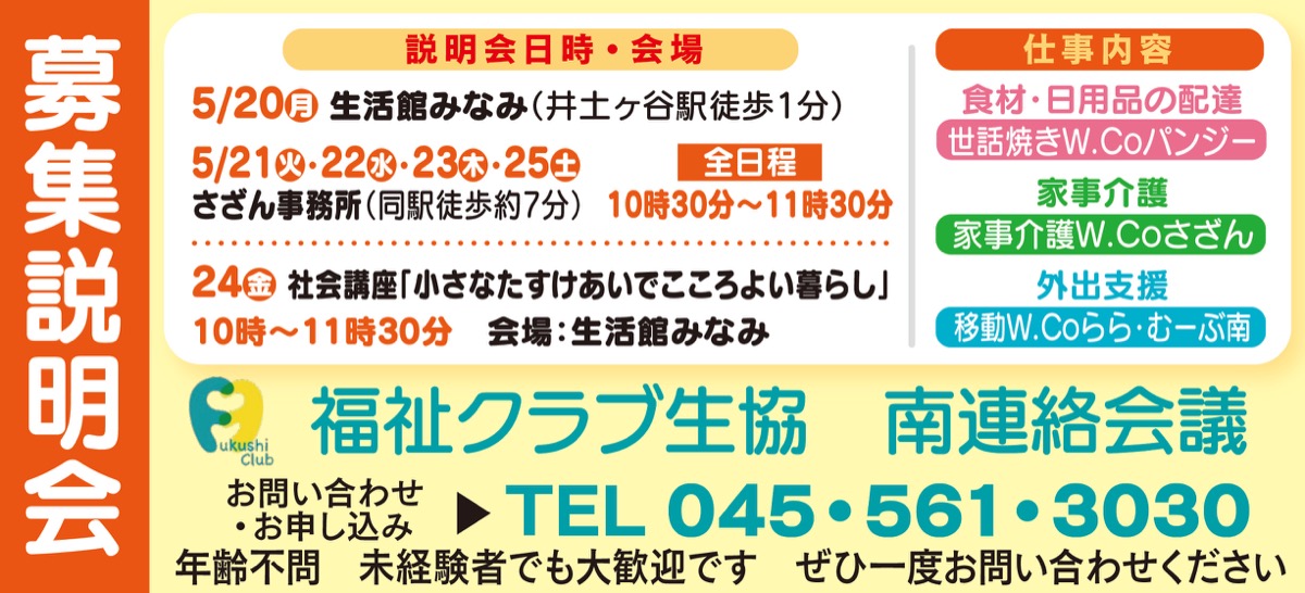 福祉クラブ生協は5月20日〜25日、南区井土ヶ谷のさざん事務所などで有償ボランティアの募集説明会を開催する。24日は社会講座で、世代を超えてつながりで育む共生社会を考える。