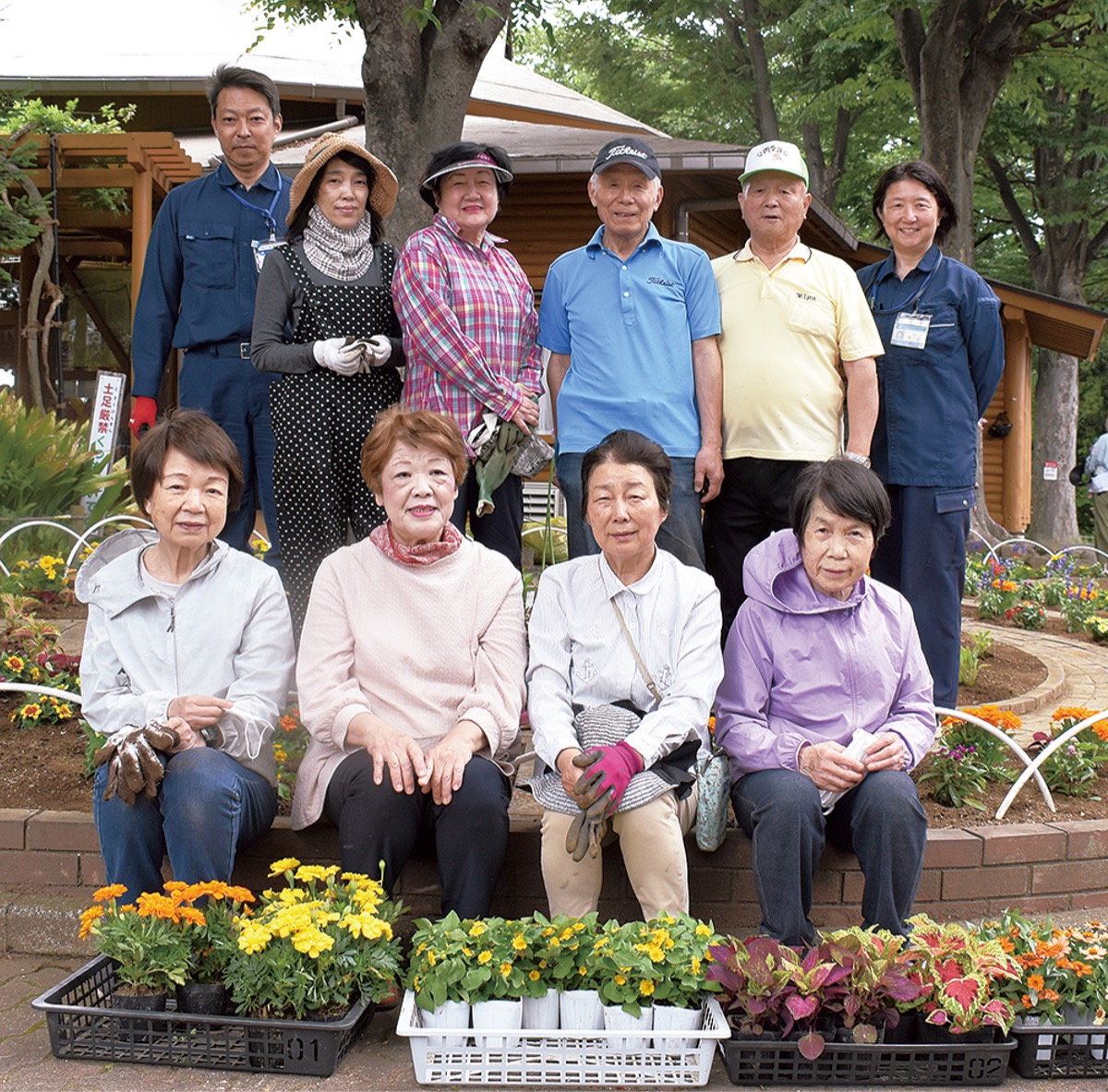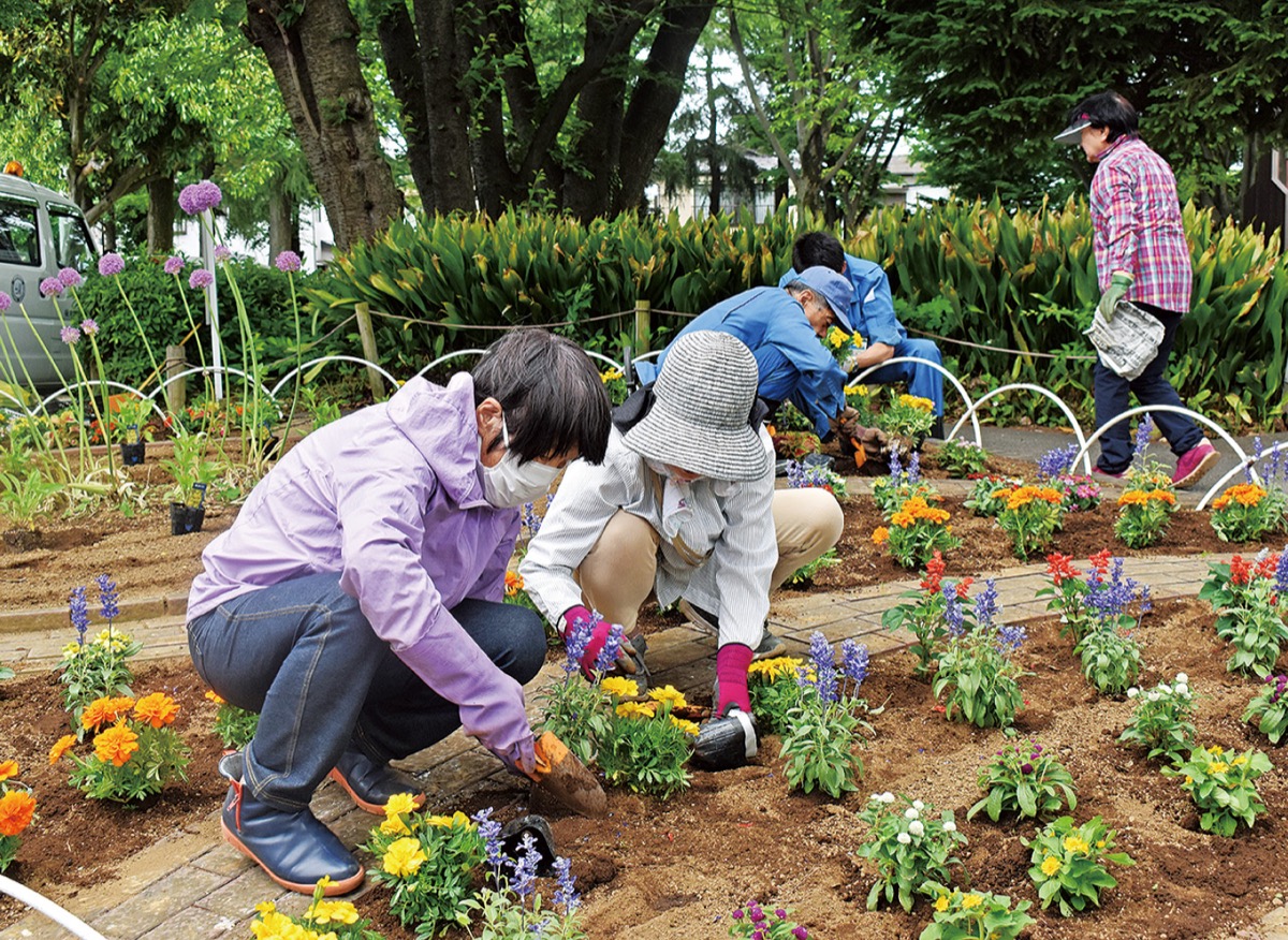 5月23日は会員8人が参加し、花壇にセンニチコウやサルビア、マリーゴールドなど色とりどりの花苗を植えた。