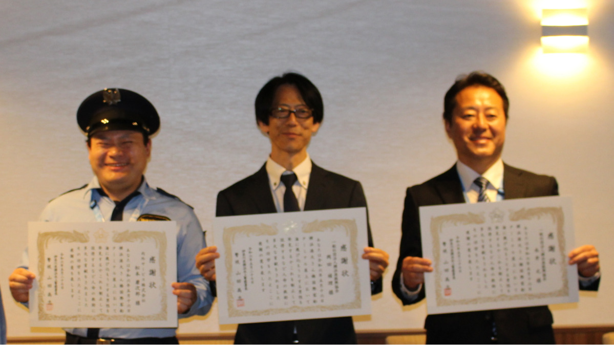 横浜水上警察署は5月27日、自殺しようとした20代男性を制止したとして、(一社)横浜港振興協会の永井元さん(49)と岡田禎理さん(50)、内外サービス(株)の松本康次郎さん(30)に感謝状を贈呈した。