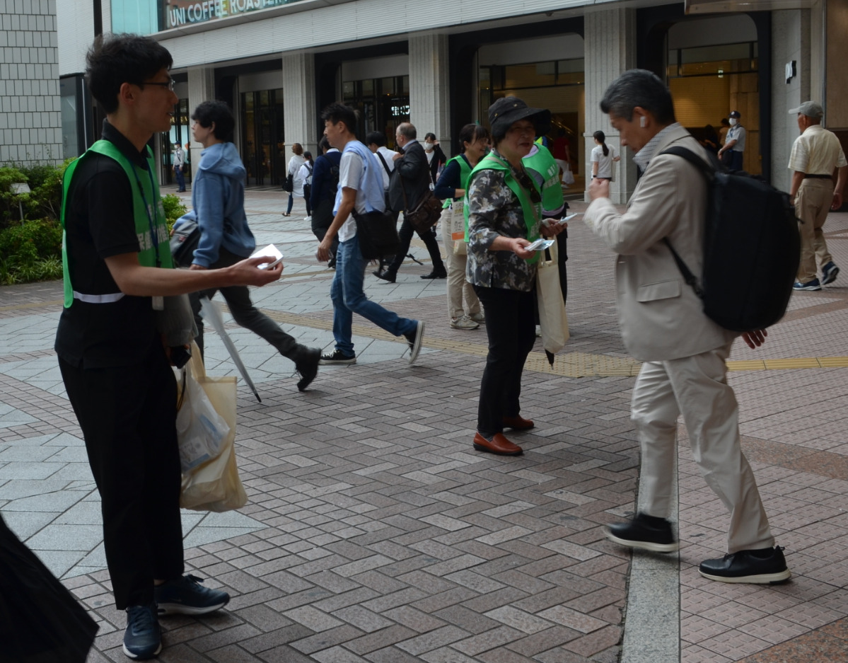 参加者は各エリアに分散し、空き缶やたばこの吸い殻のごみ拾いや落書きの除去などの清掃のほか、歩きたばこ・受動喫煙と自転車放置の防止の啓発活動を実施した。
