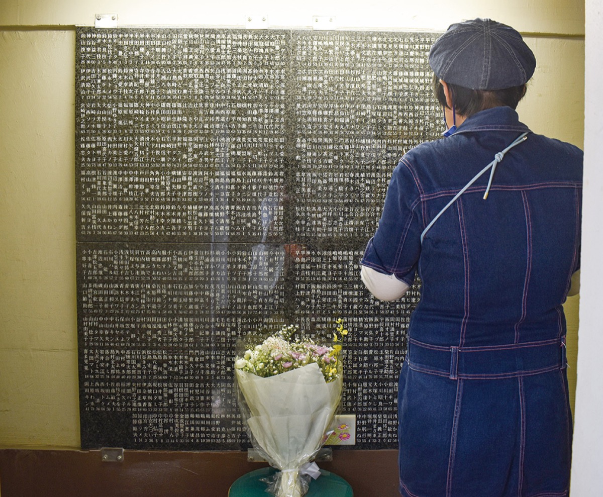 大通り公園内にある「平和祈念碑」=高根町=では同日、冥福を祈る遺族らの姿が見られた。記念碑内部には、空襲で命を落とした犠牲者約900人の氏名が記された銘板が安置されている。普段は施錠されているが、当日は内部が公開された。