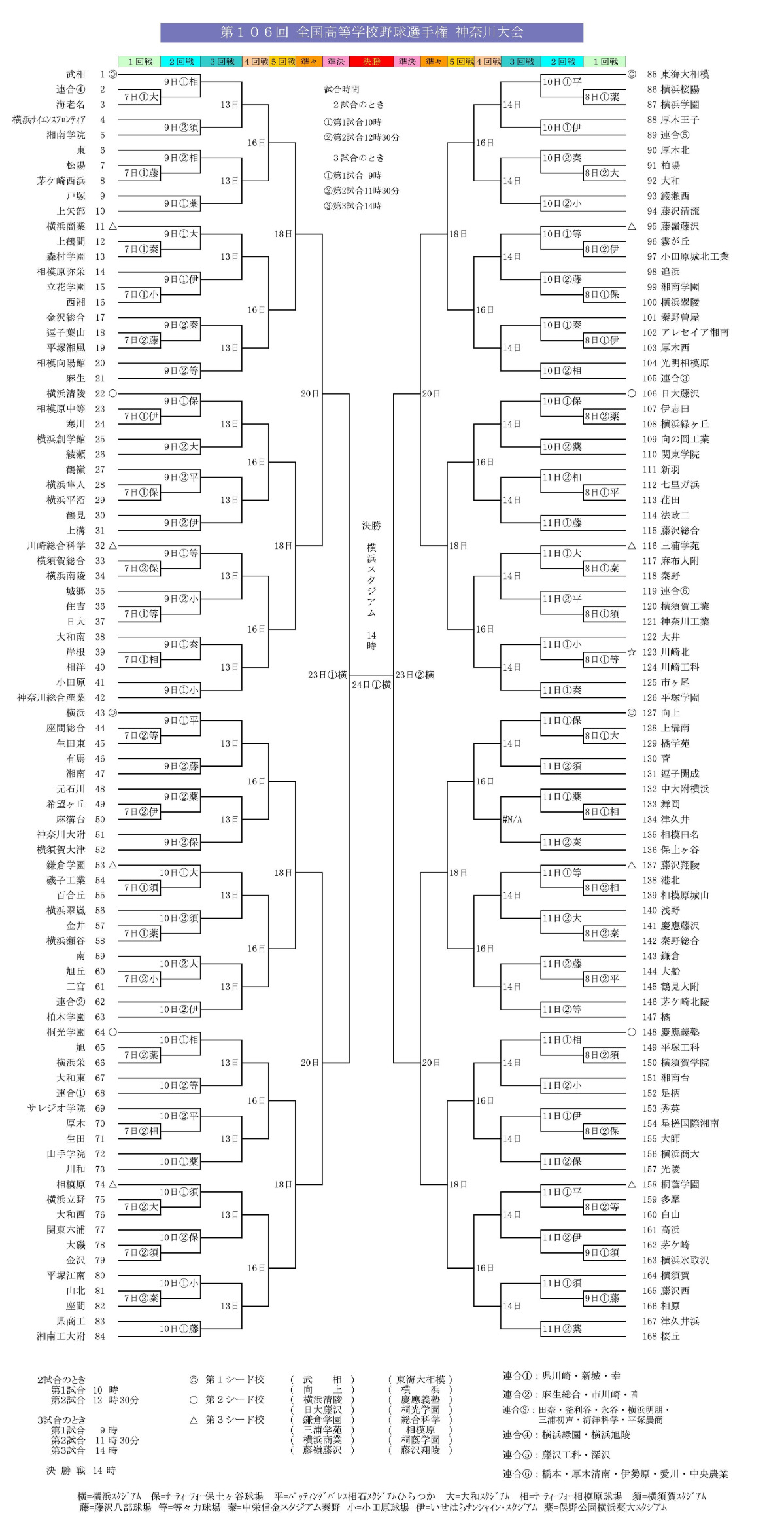 第1シードは武相、向上、東海大相模、横浜の4チーム。昨夏の甲子園で優勝した慶應義塾のほか、横浜清陵、日大藤沢、桐光学園が第2シード。第3シードは鎌倉学園、三浦学苑、横浜商業、藤嶺藤沢、総合科学、相模原、桐蔭学園、藤沢翔陵の8チーム。