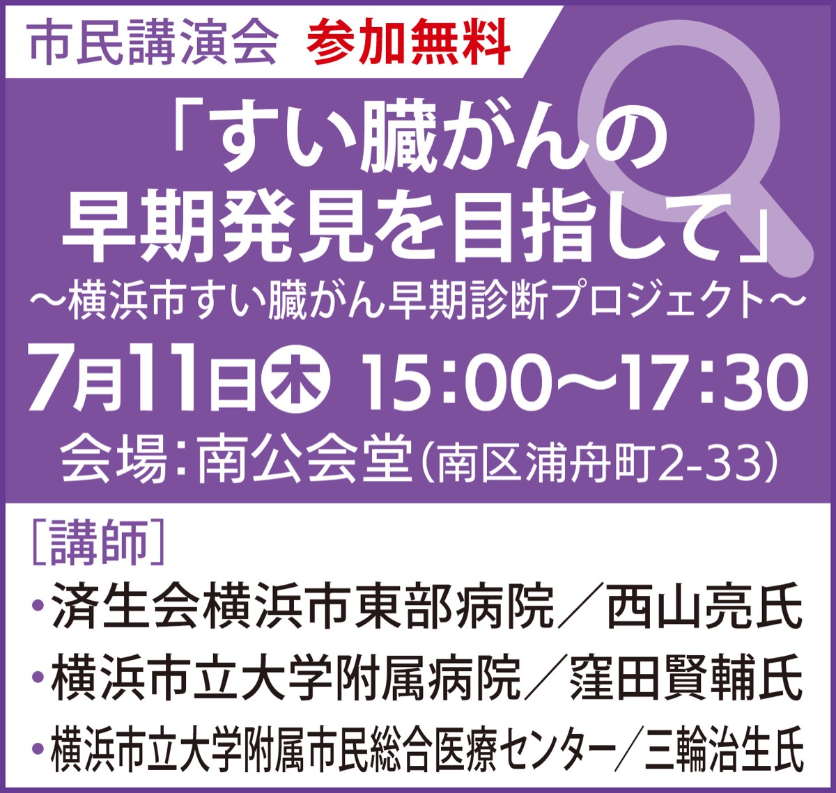 がんの中でも生存率が低いとされる「すい臓がん」の早期診断について学ぶ市民講演会が7月11日(木)、南公会堂(阪東橋駅8分)で行われる。