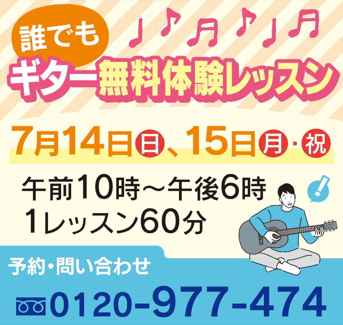 南区井土ケ谷の音楽教室「アダチ音研」は7月14日(日)・15日(月)(祝)の2日間、エレキ・フォークギターの無料体験レッスンを実施する。