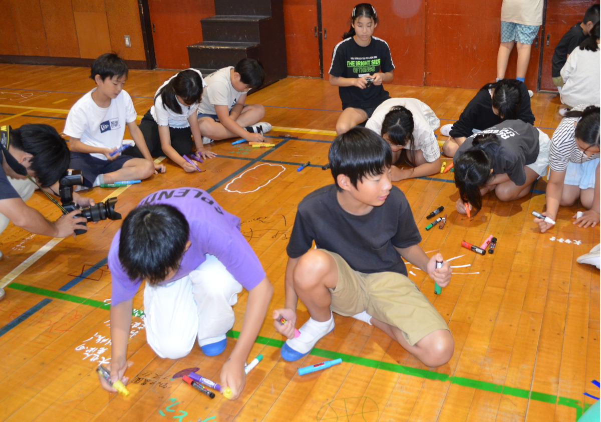 本牧南小学校=中区本牧元町=で6月28日、床の張り替え改修工事前の体育館に全校児童249人が感謝のメッセージを書いた。中村宏校長の「最後に思い出を形にして残せたら」という思いつきから始まったもので、体育館での思い出や感謝の気持ちを絵や文章で表現した。
