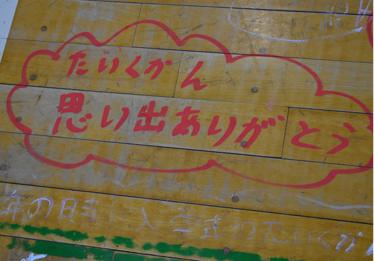 6年生の千葉柚希さんは「委員会活動の全校集会で司会をしたり、放課後のバスケットボールスクールで練習をしたことが記憶に残っている。新しい体育館になる前にさらに思い出を作れて良かった」、佐藤琉羽さんは「入学式の時からお世話になった。できなかった前転ができるようになったり成長させてくれた場所。感謝の思いを込めて『大好き』と書いた」と、それぞれの思い出を振り返っていた。