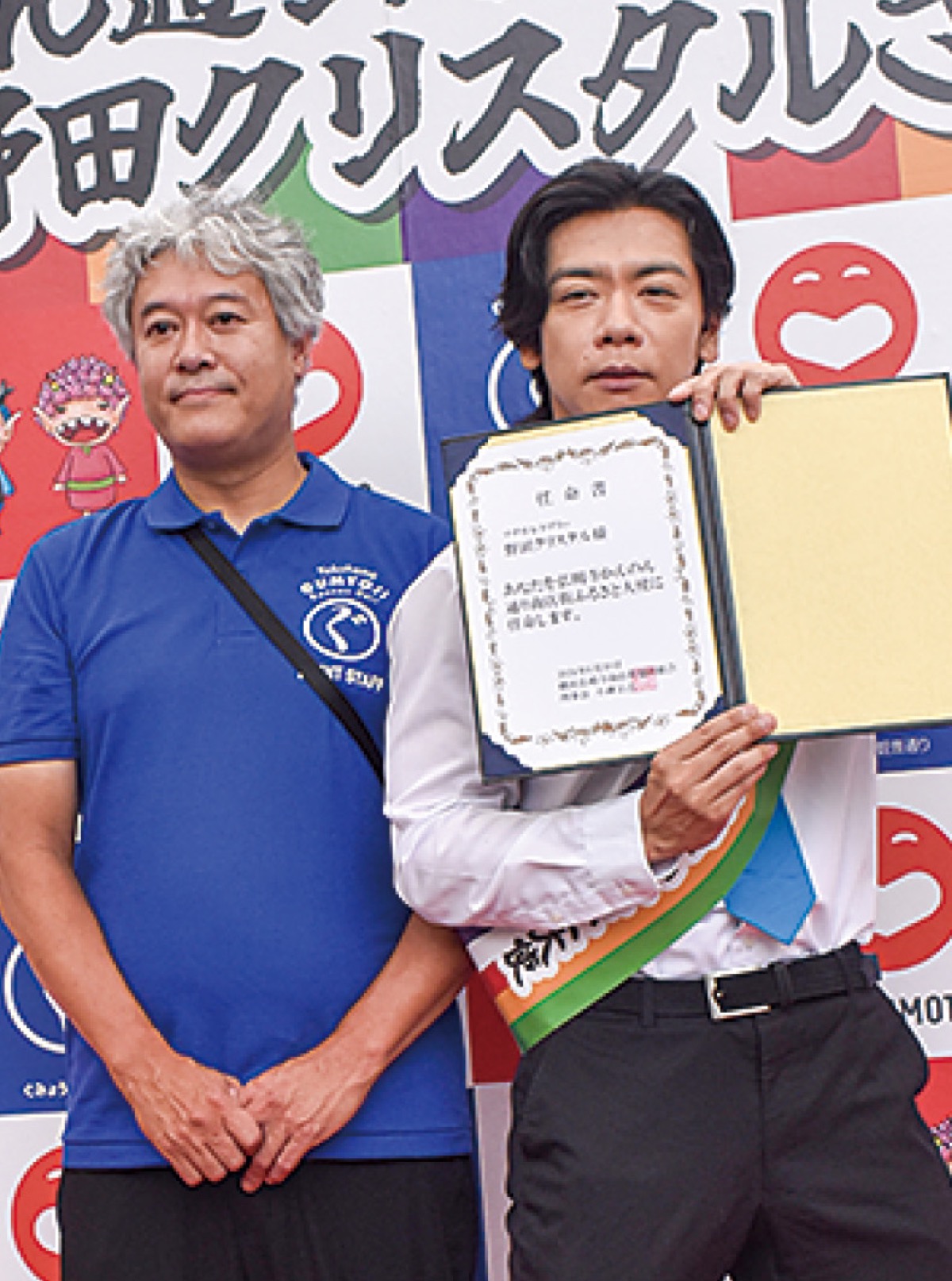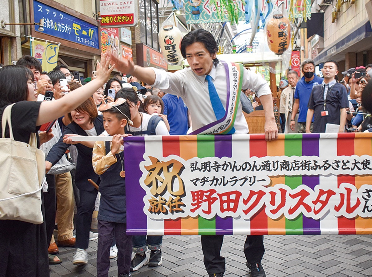 南区六ツ川出身のお笑い芸人・マヂカルラブリーの野田クリスタルさんの「弘明寺かんのん通り商店街ふるさと大使就任式」が6月30日、同商店街で行われた。約3千人が訪れ商店街が人で埋め尽くされるほどの賑わいで、トークショーやパレードが行われた。