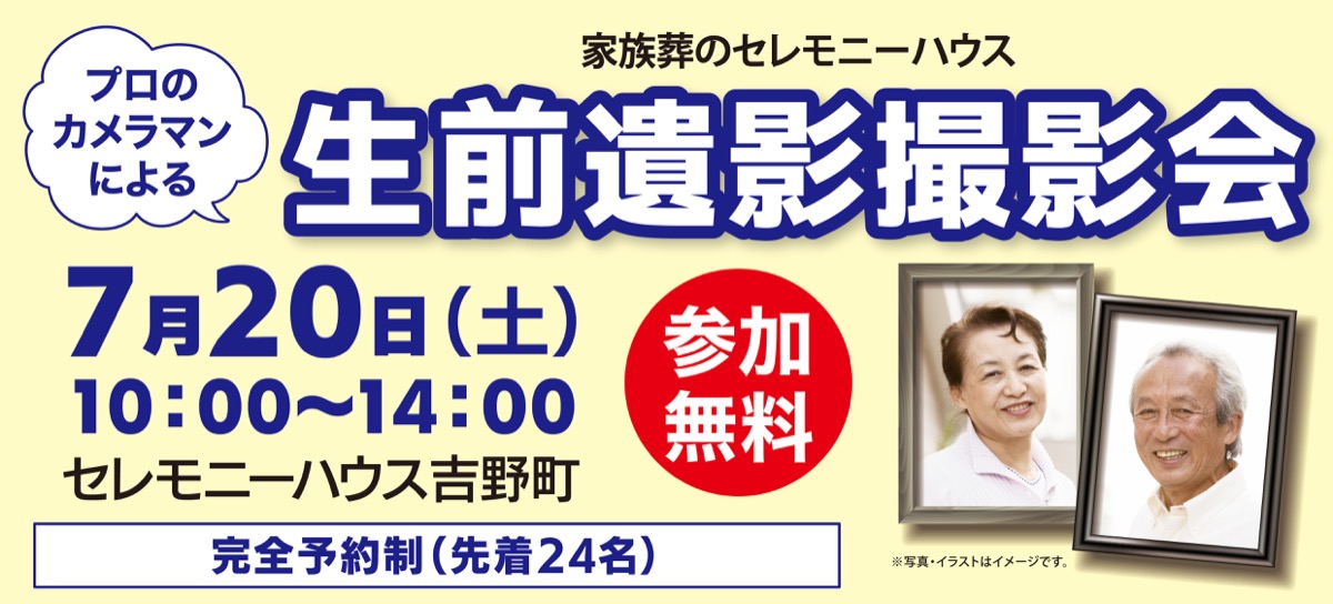神奈川県を中心に直営28ホールを展開する「家族葬のセレモニーハウス」。同社は「終活」で一番大事ともいえる「遺影」の生前撮影会を定期的に開催している。7月20日(土)には、「セレモニーハウス吉野町」で開催する。