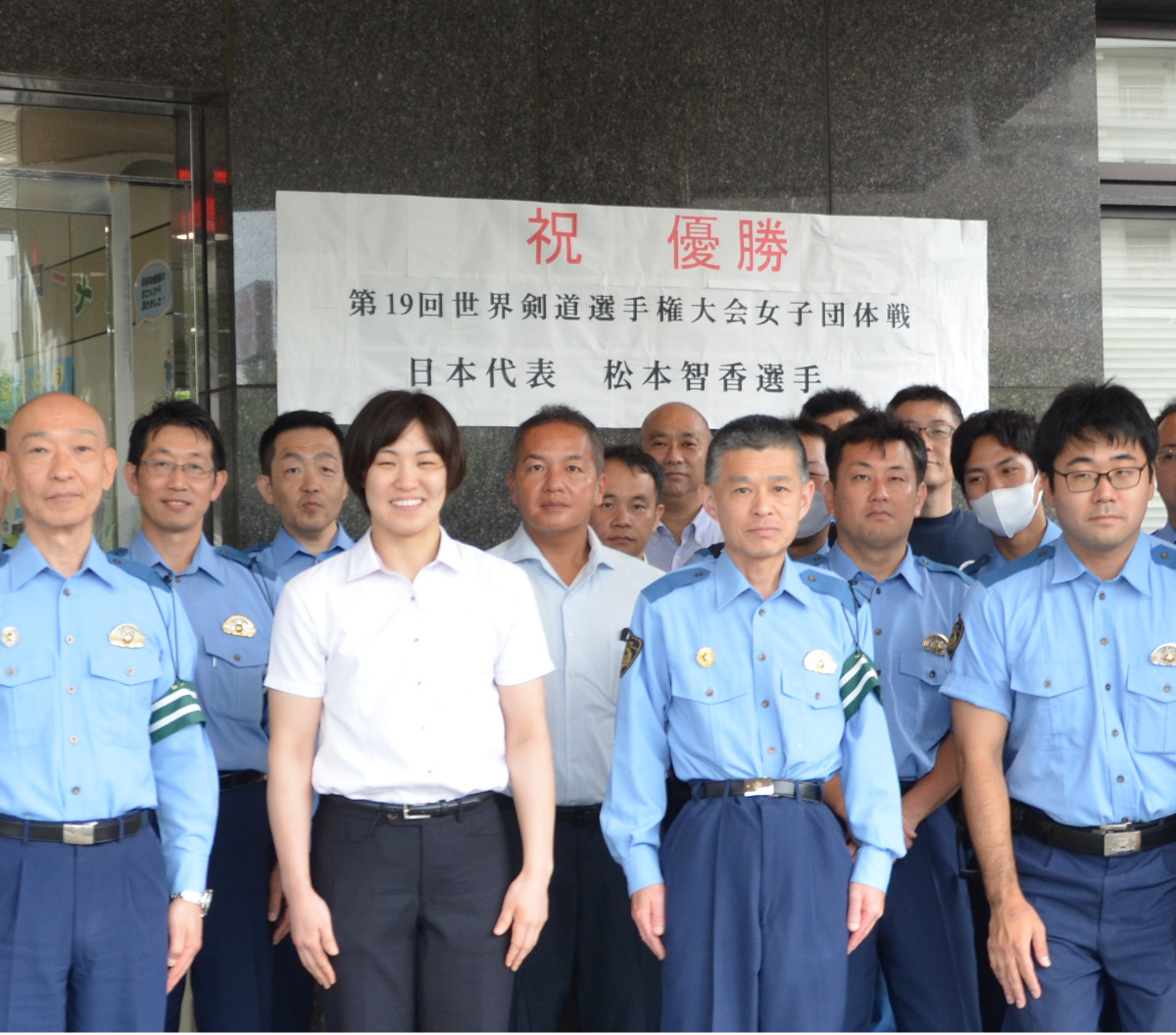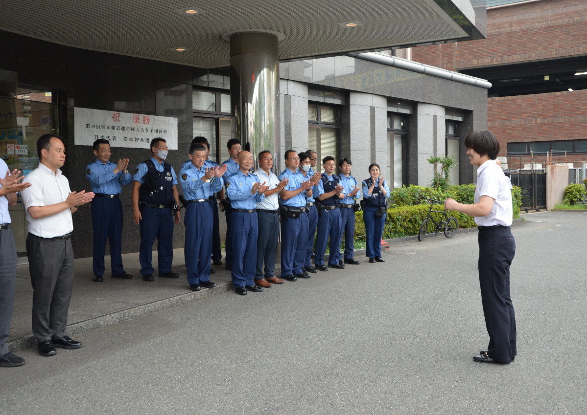 11日には、帰国した松本さんを署員が拍手で出迎えた。祝・優勝の横断幕の前で松本さんは「皆さんの応援のおかげで優勝できました」と感謝の思いを口にした。