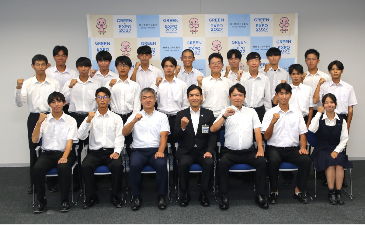 区役所を訪れたのは佐藤邦宏監督と選手やマネジャーなど21人。選手全員が自己紹介をした上で決意を述べた。杉本涼悟主将(3年)は「多くの方の期待を感じる。全国大会でしっかりとした姿を見せたい」と語り、3年前の選手権大会で初戦敗退だった先輩たちのためにもまずは1勝したいと誓った。
