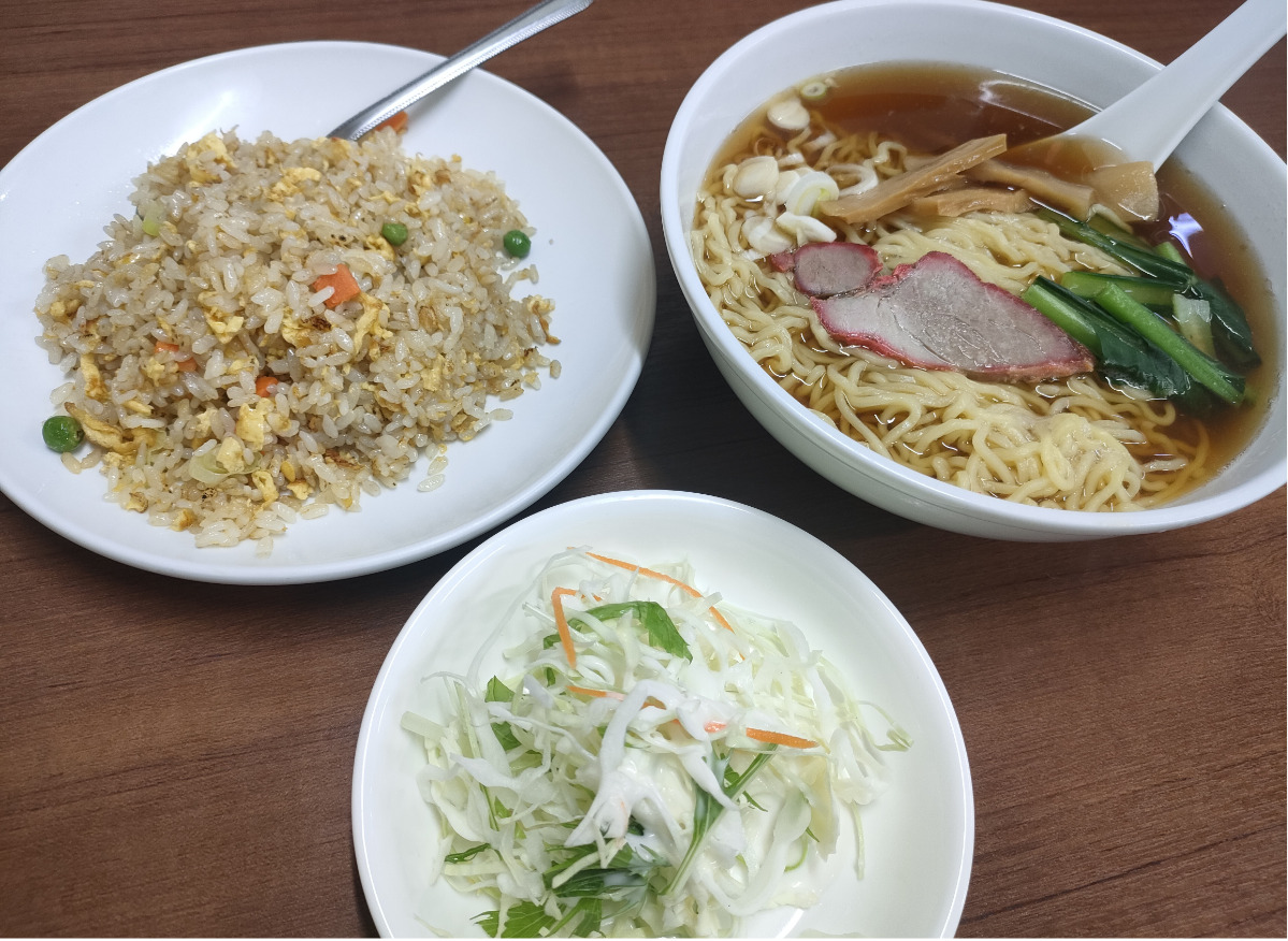 ランチタイムの定番とも言える「ラーメン+半チャーハン」のセットはサラダも加わり、見た目も鮮やか。ラーメンはシンプルでチャーハンとの相性も良い。半チャーハンも「半」とは思えぬボリューム。
