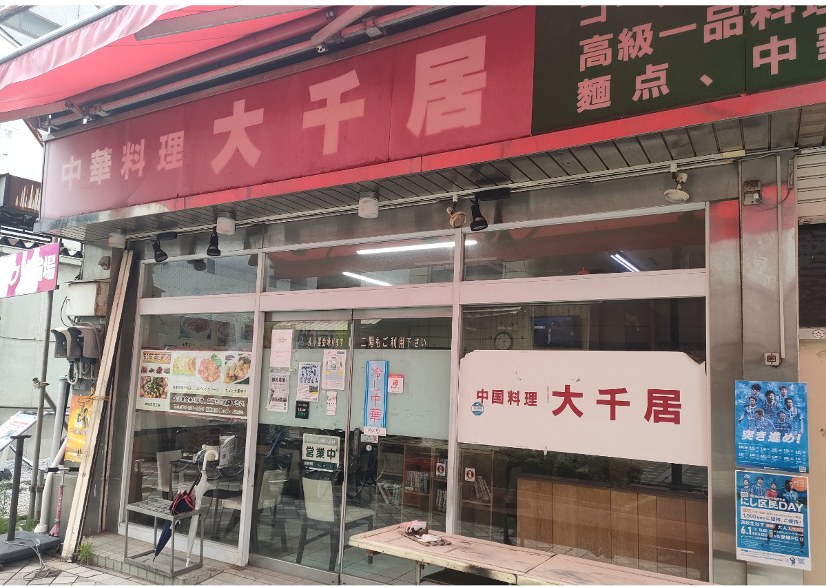 西区藤棚に連なる商店街の一つ「サンモール西横浜商店会」にある「中華大千居」。外から見ると横長の店舗が印象的。店内はテーブル数も多く、ランチ時だけでなく、夜もゆっくりできそう。