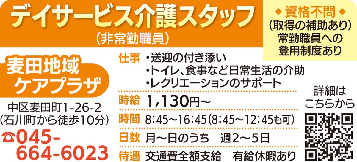 横浜市麦田地域ケアプラザは、高齢者デイサービスの非常勤職員を募集している。