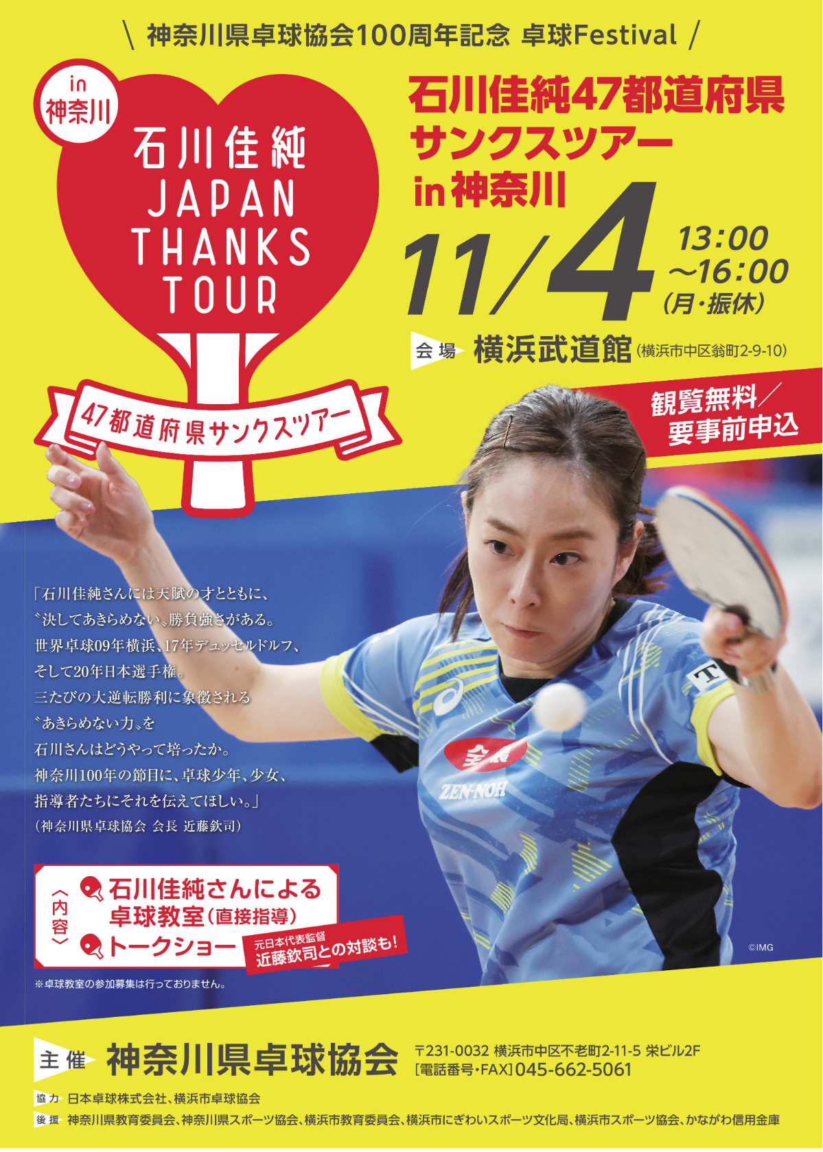ロンドン、リオ、東京の五輪3大会連続でメダルを獲得した元卓球選手の石川佳純さんが参加する「石川佳純47都道府県サンクスツアー」が11月4日(月・振休)に横浜武道館=中区=で行われる。神奈川県卓球協会の設立100周年記念事業のメイン企画。