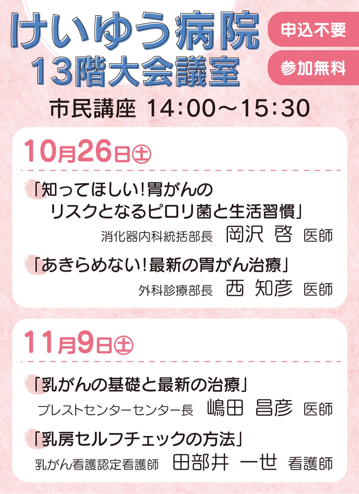 西区みなとみらいにある一般財団法人神奈川県警友会「けいゆう病院」の13階大会議室で10月26日(土)・11月9日(土)に参加無料の「市民講座」が行われる。