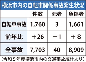 県警によると、今年1月〜9月の自転車事故は昨年同時期比で減少傾向だが、対歩行者との事故は増加。市内では鶴見区、金沢区、瀬谷区、戸塚区の4区が県交通安全対策協議会による「自転車交通事故多発地域」に指定されており、特に交差点や人が集まる駅前での事故が多いという。