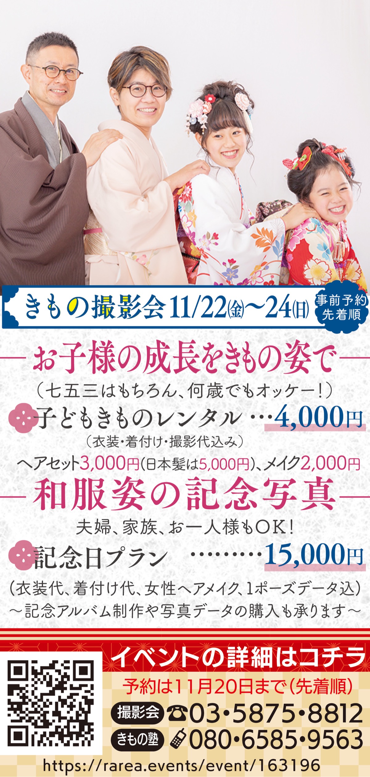 「家族で楽しむきものの日」として、プロが格安の撮影会を実施。七五三や家族写真、結婚25年の銀婚式や50年の金婚式、還暦など各種記念日プランも用意する。