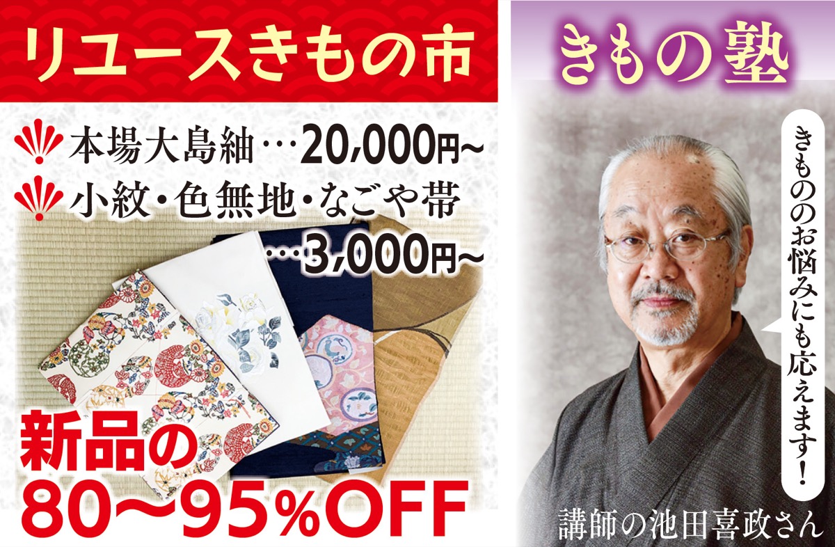 楽しく学べる「きもの塾」では元高島屋呉服担当で、きもの相談処「いけ田」を主宰する池田喜政さんが講師に。テーマは日替り(サイトで確認)で、10時30分〜1時間。受講料500円。
