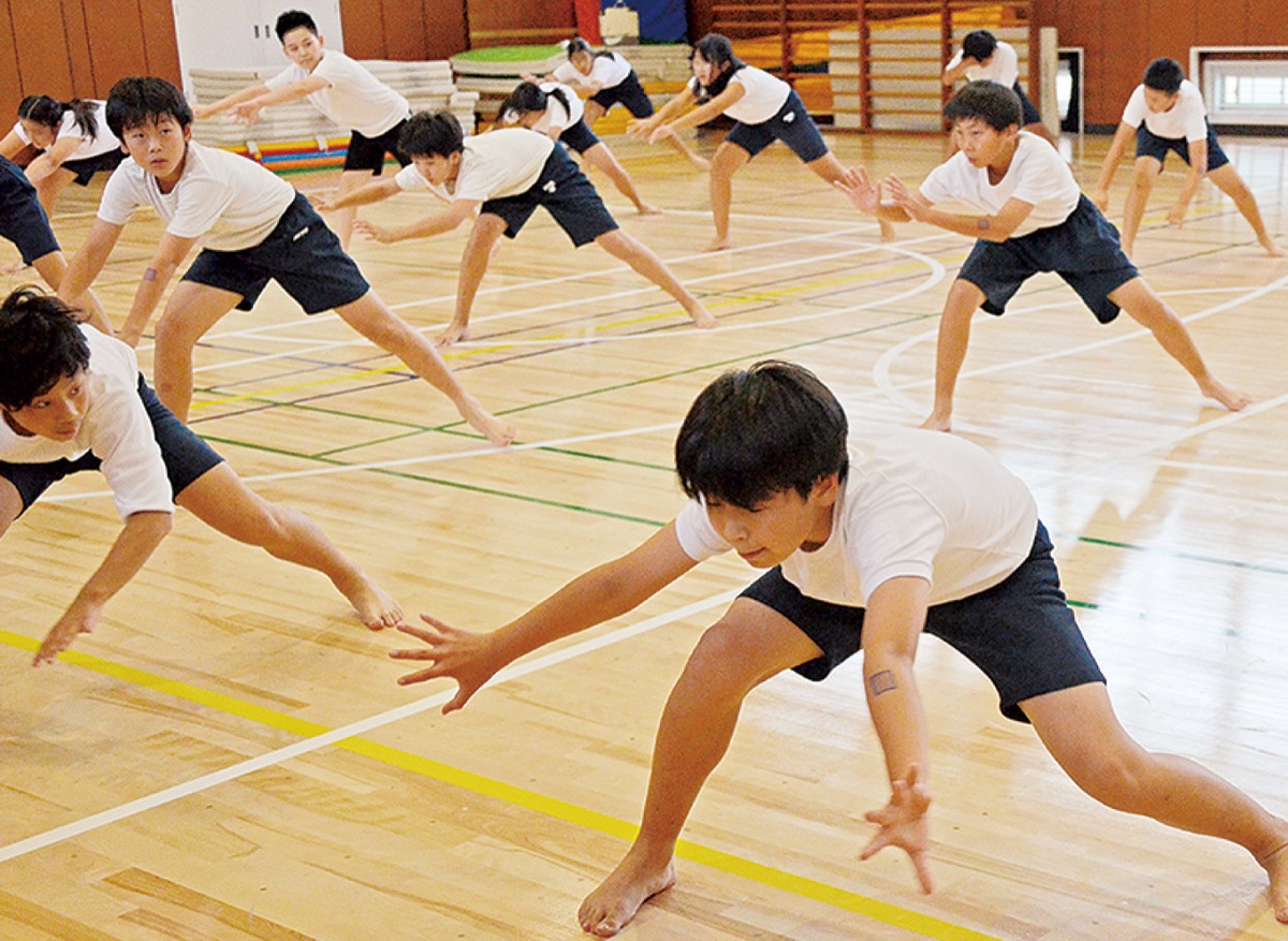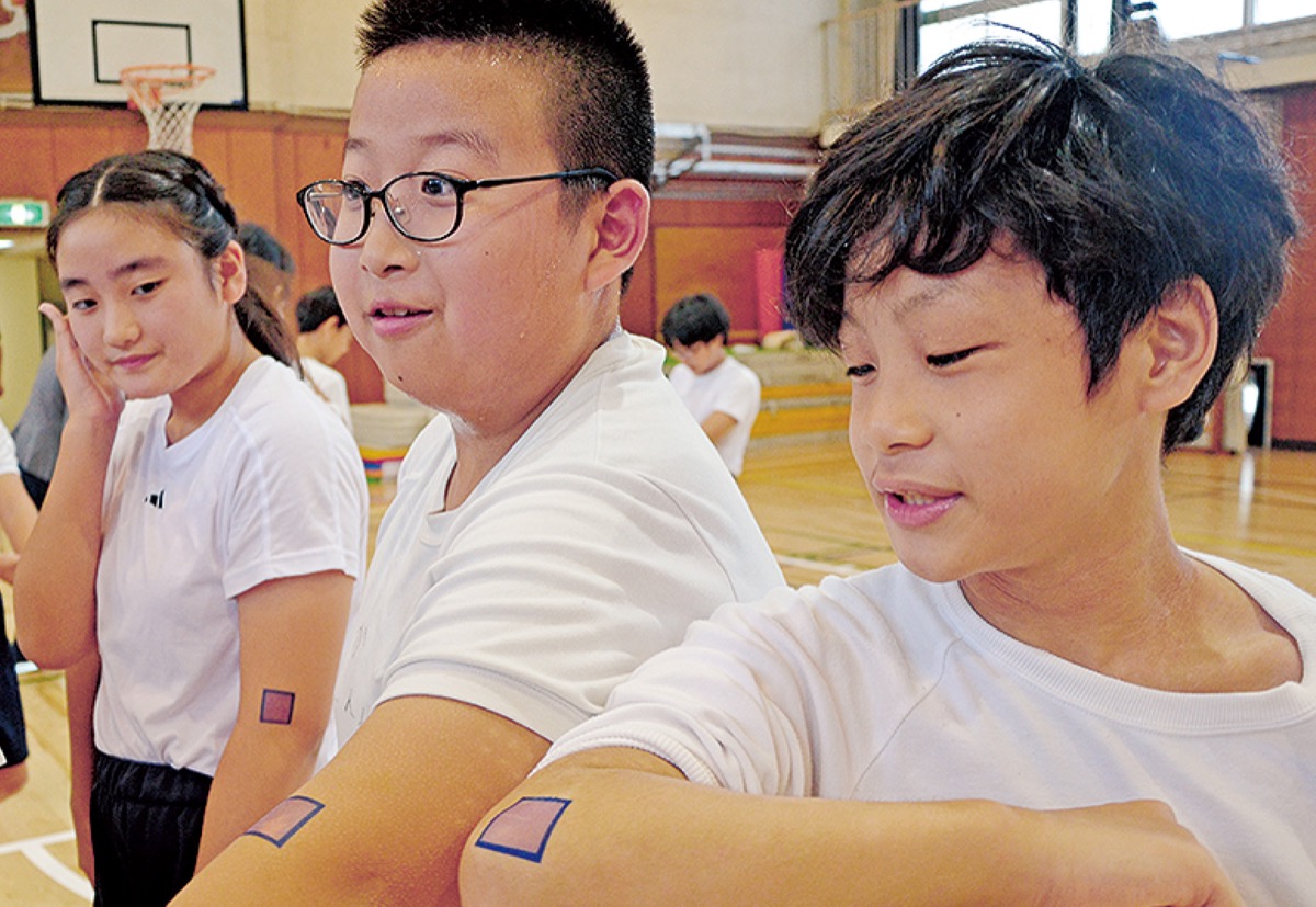 8日に同校で行われた運動会の練習では、6年生35人がソーラン節を踊り汗を流した。演舞後は腕に付けたシールの色が変化した児童が多く見られた。中村宏校長は「教諭も、子ども同士でも変化に気づける。自分の健康を把握し、意識することにつながるのでは」と話した。