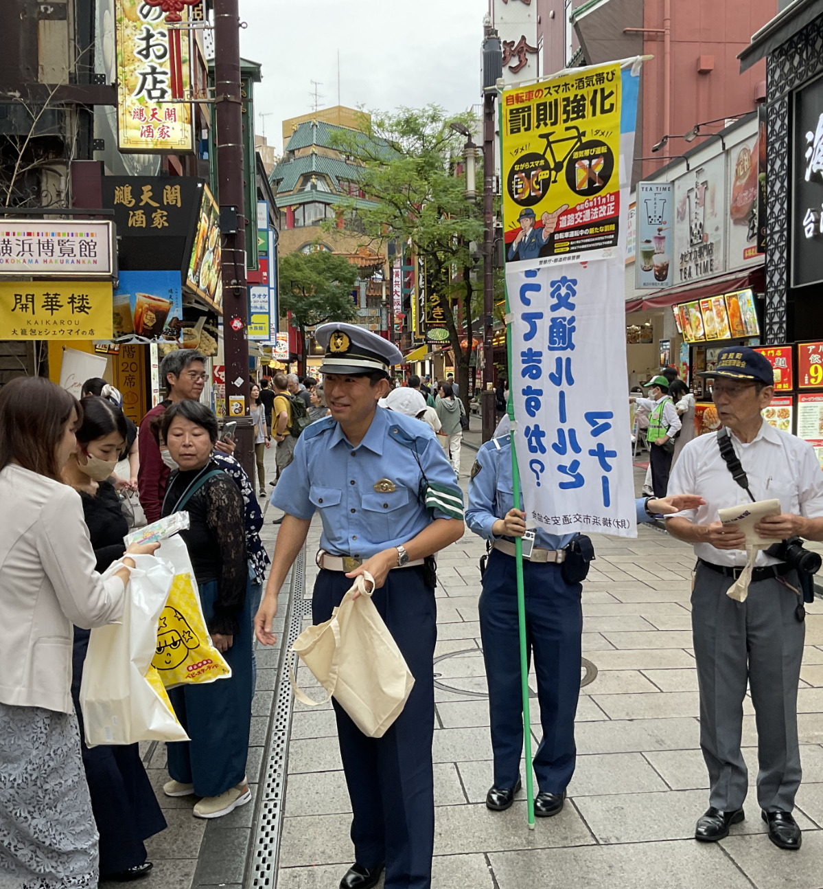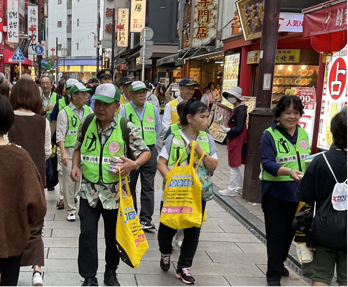 キャンペーンには加賀町防犯協会、加賀町防犯指導員連絡協議会、加賀町少年補導員連絡会などボランティア団体から約70人が参加。横浜中華街のメイン通りを往復し、「私たちはダマされません!」と書かれた特殊詐欺防止の啓発チラシと共に、キッチンスポンジを観光客らに配布した。