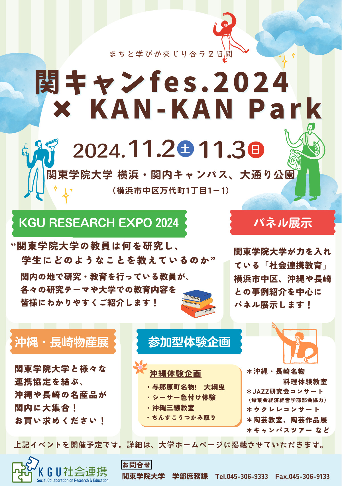 関東学院大学横浜・関内キャンパスは11月2日(土)と3日(日)に同キャンパスと大通り公園で「関キャンfes.2024 × KAN-KAN Park」を開催する。地域の「知の交流拠点」を目指す同大学。今回、「まちと学びが交じり合う2日間」として、大学の研究や教育活動を地域へ還元していく。