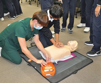 初めて講習を受けた高橋淳さん(2年)は「胸骨圧迫は結構、力が必要なことが分かった」 、伊澤奨介さん(同)は「倒れている人がいたら声を掛け合って助けたい」と早期の処置の重要性を感じていた。