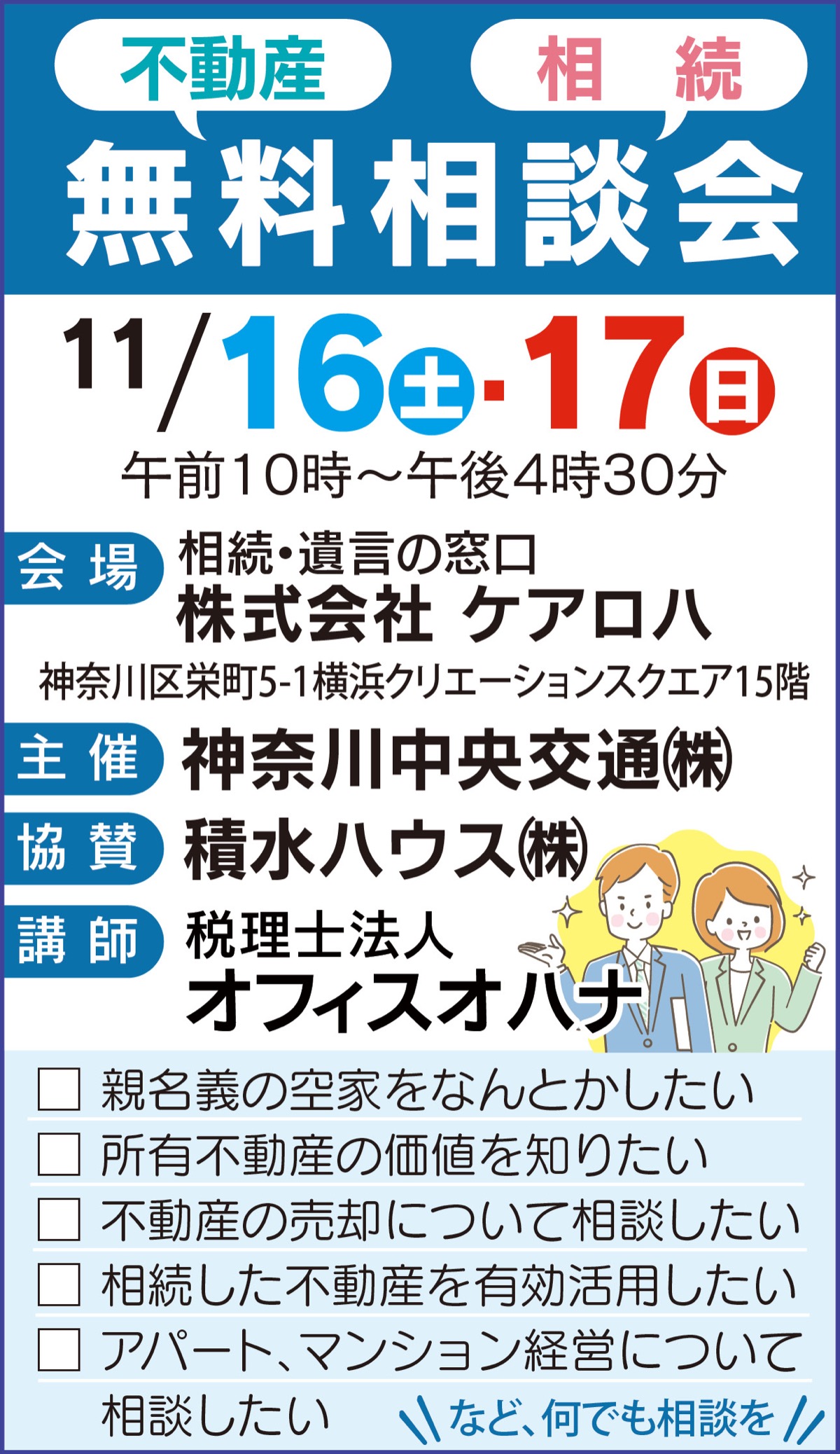 相続や不動産の「もやっ」とした悩みに専門家が応える無料相談会が11月16日(土)・17日(日)に横浜駅前の会場(JR横浜駅徒歩8分)で開かれる。主催は神奈中バスでおなじみ神奈川中央交通株式会社(積水ハウス協賛)。事前予約制で参加者を募集中だ。