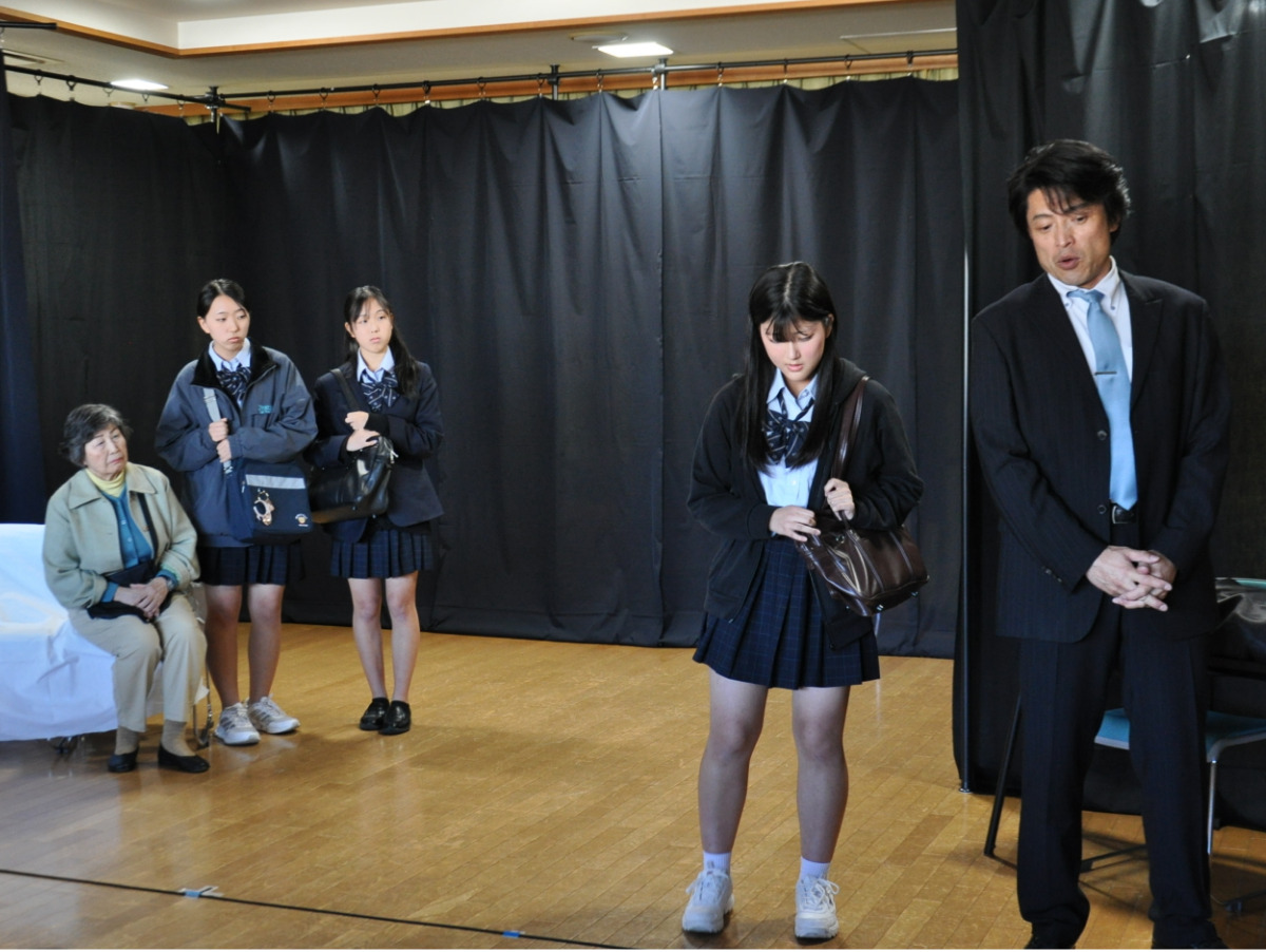 横浜立野高校=中区本牧間門=の演劇部の生徒11人が11月23日、蓑沢地域ケアプラザで防犯演劇を上演した。市内を中心に演劇や歌で社会問題を世の中に伝える団体「表現のチカラ」の代表・はだ一朗さんと山手警察署が共同で企画し、地域住民約30人が集まった。