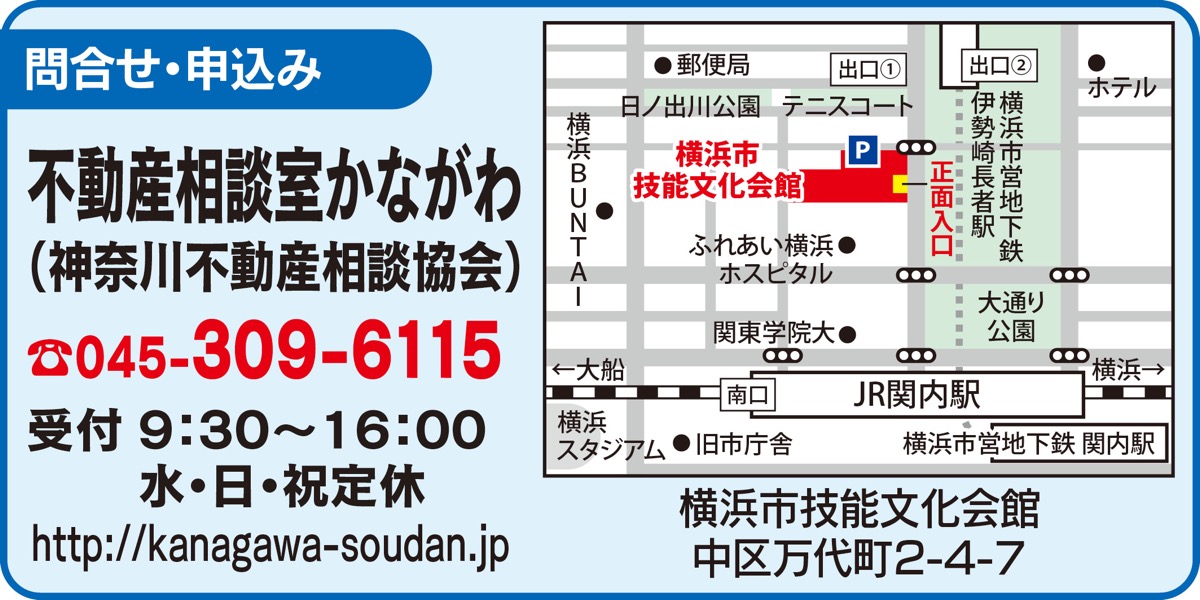 「不動産相談室かながわ」が毎月各地で開催中の相続と不動産に関する無料相談会。12月21日(土)に、横浜市営地下鉄「伊勢佐木長者町駅」出口2から徒歩3分の横浜市技能文化会館で開かれる。