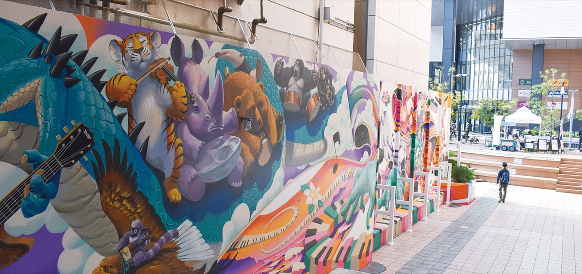 横浜駅西口、幸川橋周辺から横浜ビブレ前の公共空間の壁面約254平方メートルを使った大型壁画アートが完成した。12月7日には主催者や地域の団体、行政など関係者らが出席し、完成セレモニーとお披露目会が開かれた。